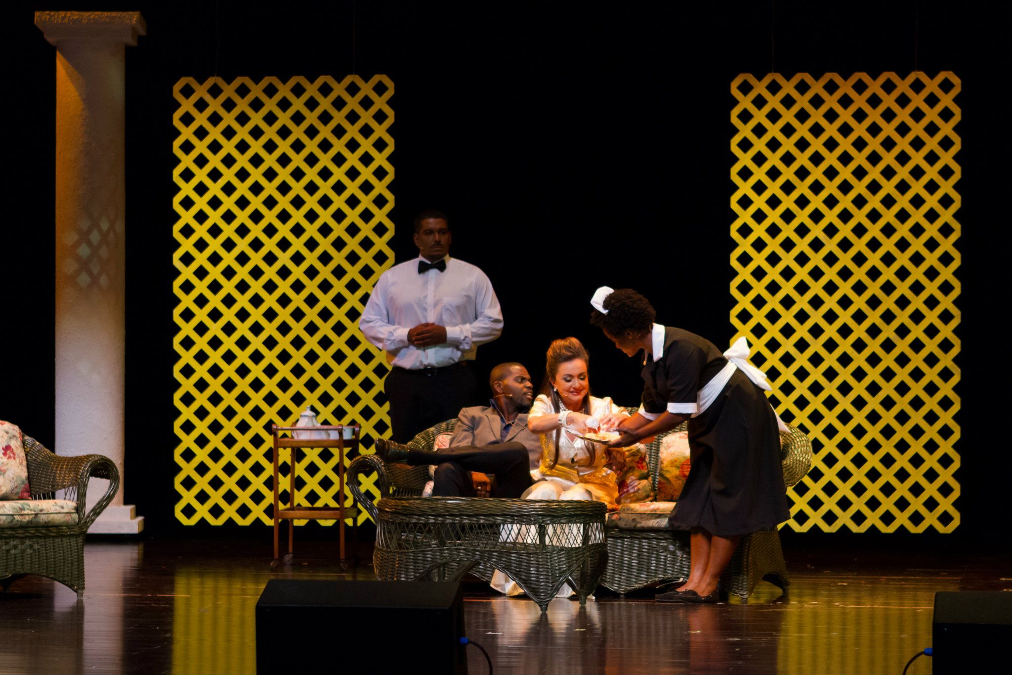 The curtains parted to reveal a mostly bare stage, the Bishop Anstey High School Steel Ensemble on top of a green platform  (Yes! Steelpa, a recurring element throughout the rest of the show. It’s set in Trinidad remember) and opened with the overture, Miss Loraine Granderson conducted in the pits where the other musicians, Gregory Wong Fu Sue on keyboards and Everald ‘Redman’ Watson the percussionist played. It was such a rich, full sound, and so well executed that my heart started to beat like the wings of the birds that rise from the lake through the trees. With no disrespect to Mr. Wong Fu Sue (A very talented musician in my opinion) I thanked the stars that the accompaniment wasn’t just him on the  keyboard as I have become accustomed to in other musical productions . A keyboard alone, ONE KEYBOARD in a MUSICAL can never compare to the full awesomeness of an orchestra. In a musical the QUALITY of the MUSIC matters, and unfortunately many of the newer production companies seem to sacrifice that factor in favor of producing a visual spectacle. Ah Yes! The Overture was beautiful. I think I even forgot for a moment that it was a steel band playing. It sounded like a recording with a million and one strings, a timpani or two, and all the other instruments that the orchestrator envisioned for the score. I wasn’t feeling the localness that I dreaded. This production was off to a good start…