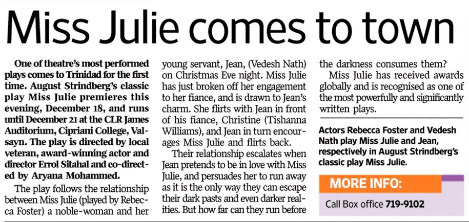 On Thursday 18 December, 2014 Cipriani College’s CLR James Auditorium housed the opening of FAB-Productions‘ first production of “Miss Julie“, written by August Strindberg in (1888). It was Directed by Errol Sitahal, Co-Directed by Aryana Mohammed and Produced by Farrukh Altaf Barlas. Rebecca Foster played “Miss Julie”, Vedesh Nath played “Jean”, Tishanna Williams played Christine and Renee King played “Clara”.