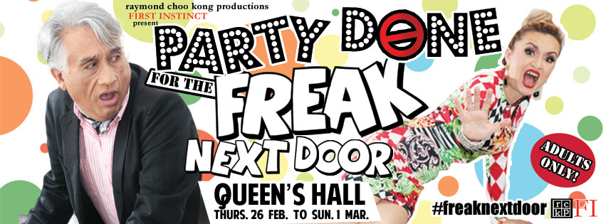 Thursday 26th February 2015; the Queen’s Hall opening of “PARTY DØNE for the FREAK NEXT DOOR”. Raymond Choo Kong Productions and First Instinct have teamed up once again, promising a “Comedy with TESTICULAR FORTITUDE!!!” and I ventured out into the unexpected dry season rain, to witness “a Choo Kong play” for the very first time. The “Mary Could Dance” director lives up to his name, directing and writing yet another ‘Adults Only!’ sex comedy that just might prove successful at the box office, despite the not-so-catchy production title. Although “testicular fortitude” may be an oversight, the play is full of laughs and worth watching after a hard day’s work.