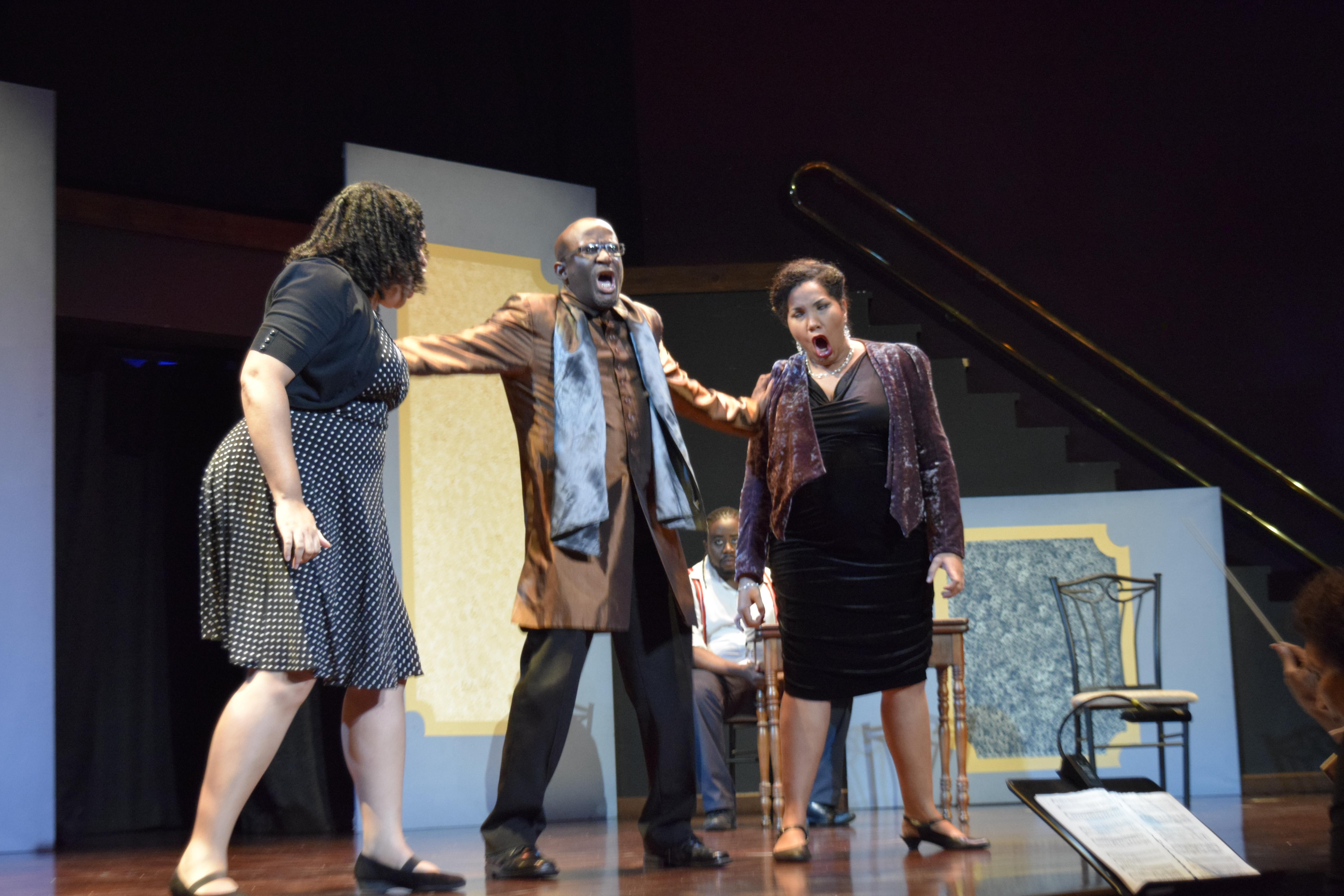 Absolutely no stranger to the world of classical music and a formidable leading lady, Dopwell showed exactly why her name holds such acclaim. Her soaring soprano range and smooth and light vibrato electrified her performance as Madame Hertz. She wowed the crowd with her portrayal of the pseudo-ingénue, using her coquettish wiles and an undertone of severity to manipulate outcomes in her favor. Her rendition of the “audition” piece “Da schlägt die Abschiedsstunde” (”There tolls the hour of departure”) was simply stunning. There were moments of velvety high soprano that rung through the hall with such clarity and her poise could be heard in every note. As the rival soprano diva Mademoiselle Silberklang, Ayrice Wilson complimented her superbly, showing the other commanding and bordering villainous side of the soprano voice. Also coming in for her “audition”, her rendition of “Bester Jüngling” (Dearest Young”) had Buff eating out of her hands. Her unique and poignant soprano combated Dopwell’s light and silky voice, most pointedly so in their battle of the divas. This is where the hilarious colloquial rewrite of the piece truly shone as the divas listed their many accomplishments of Girl School functions and community center affairs across Trinidad and Tobago. Notable mention goes to Diahann White who throughout the performance interjected the diva duel with a feistiness only a mezzo-soprano can.