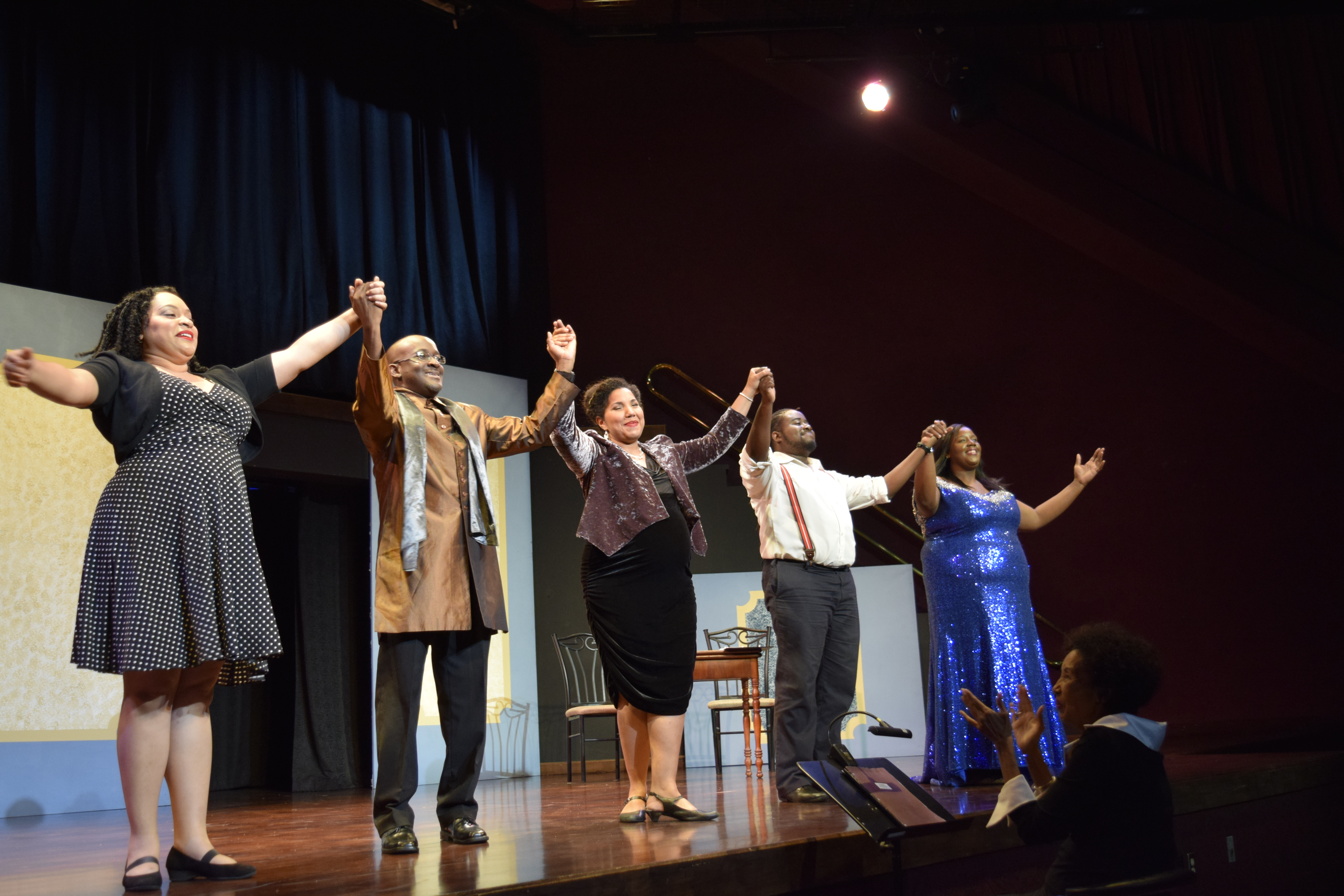 Notwithstanding the incredible work of the Broadway Revue, the true magic of the night lay in The Impresario. Curtains rose on Buff (Krisson Joseph) who, without waiting for the maestro (effortlessly and expertly played by Professor Hayward Mickens) launched into a brassy aria, showing the power and sensuality of a bass/baritone. This, having only minutes before closed the first half with the tongue-twisting and demanding number “I am the Very Model of a Modern Major General”. His impromptu rehearsal is interrupted by Monsieur Vogelsang (Kendall Reid), the impresario of the yet to be named theatrical company with the company’s biggest (and seemingly only patron) Madam Hertz, played by Natalia Dopwell.