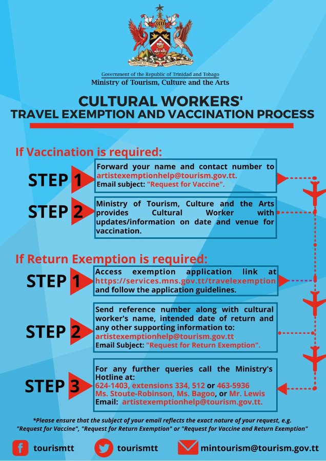 Application forms can be accessed online at www.tourism.gov.tt, email artistexemptionhelp@tourism.gov.tt , or call the Ministry of Tourism, Culture and the Arts at 624-1403 extensions 334 & 512.