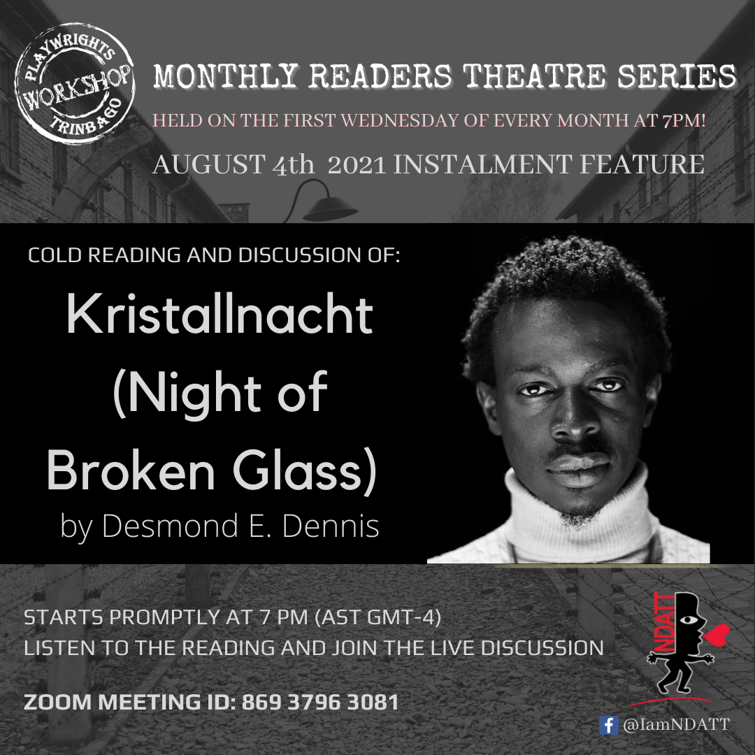 Tomorrow, the National Drama Association of Trinidad and Tobago’s (NDATT) Playwrights Workshop Trinbago (PWT), will feature the reading of Kristallnacht (Night of Broken Glass) by Jamaican playwright – Desmond E. Dennis, for the July instalment of the Monthly Readers Theatre Series (MRTS). The series, which is held the first Wednesday of every month, will continue online in light of the precautionary measures implemented as a result of the COVID-19 pandemic. The reading will take place at 7 PM (AST GMT-4) via Zoom.