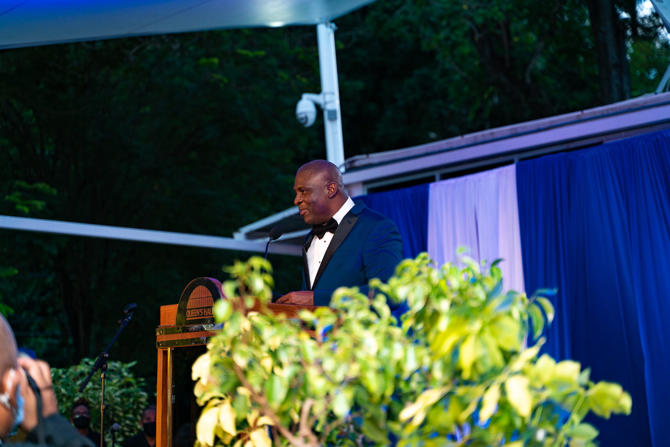 The renovations included a tent-like coverage above the 25′ x 60’/ 1500 sq. ft space, and a 20’ x 16’ x 3’h modular stage installed on the southern end of the courtyard, abutting the Helen May Johnstone Room. The northern end of the courtyard featured a branded, glass wall waterfall installation, surrounded by a beautifully appointed rock and shrubbery garden with mood lighting.