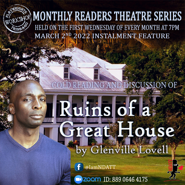 This Wednesday, the Playwrights Workshop Trinbago’s (PWT) Monthly Readers Theatre Series (MRTS) features the reading of Ruins of a Great House by Glenville Lovell for their March 2022 instalment. The series will continue online in light of the precautionary measures implemented as a result of the COVID-19 pandemic. The reading will take place via Zoom meeting only on March 2 at 7 PM (AST GMT-4).