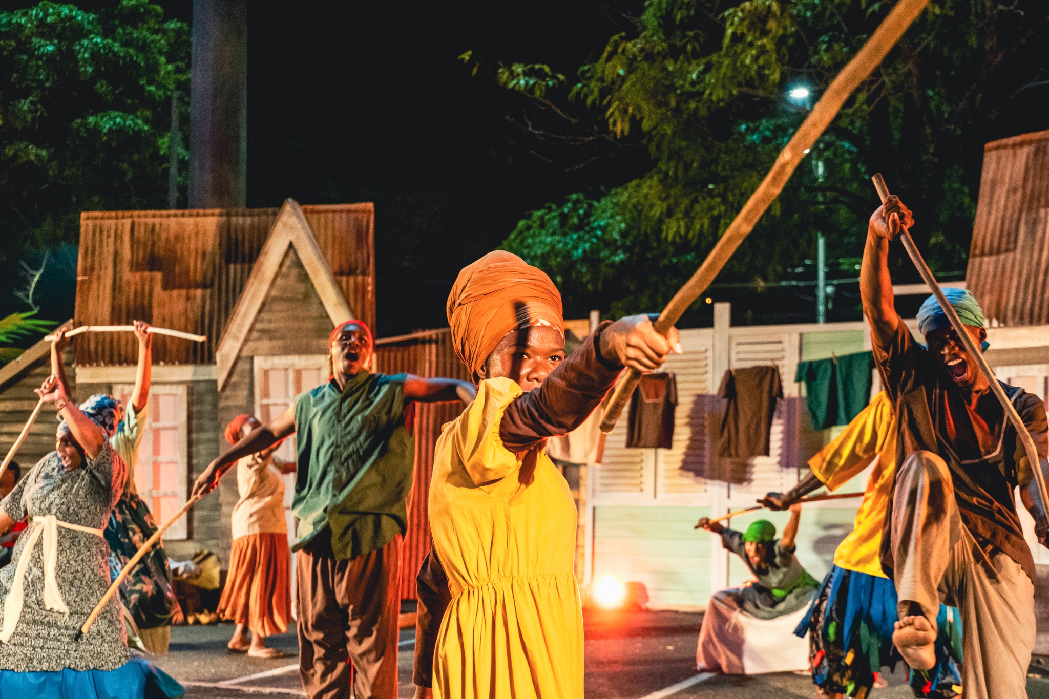 This is where I would hope that the reenactment aspect comes in a little bit stronger. The script is phenomenally written, and this goes without saying. After all, it is the pen of Eintou Pearl Springer. My belief is that a local epic of this nature ought to assume the ignorance of the audience, take us by the hand and walk us through why this is so important, why the jammettes lived the way they did and what happened overall. Moments like the argument between the characters of Alice Sugar and Wilicia, for instance, as well as the narrators’ heckling of Carriso Jane seem to come out of nowhere and don’t particularly propel the plot. At first glance, one would look at these scenes sideways and question what they are truly intended to portray about the gender politics of the jammette yard. Knowing the context, I can surmise, but from looking at the play world itself, there is a question mark over the intent of these depictions.