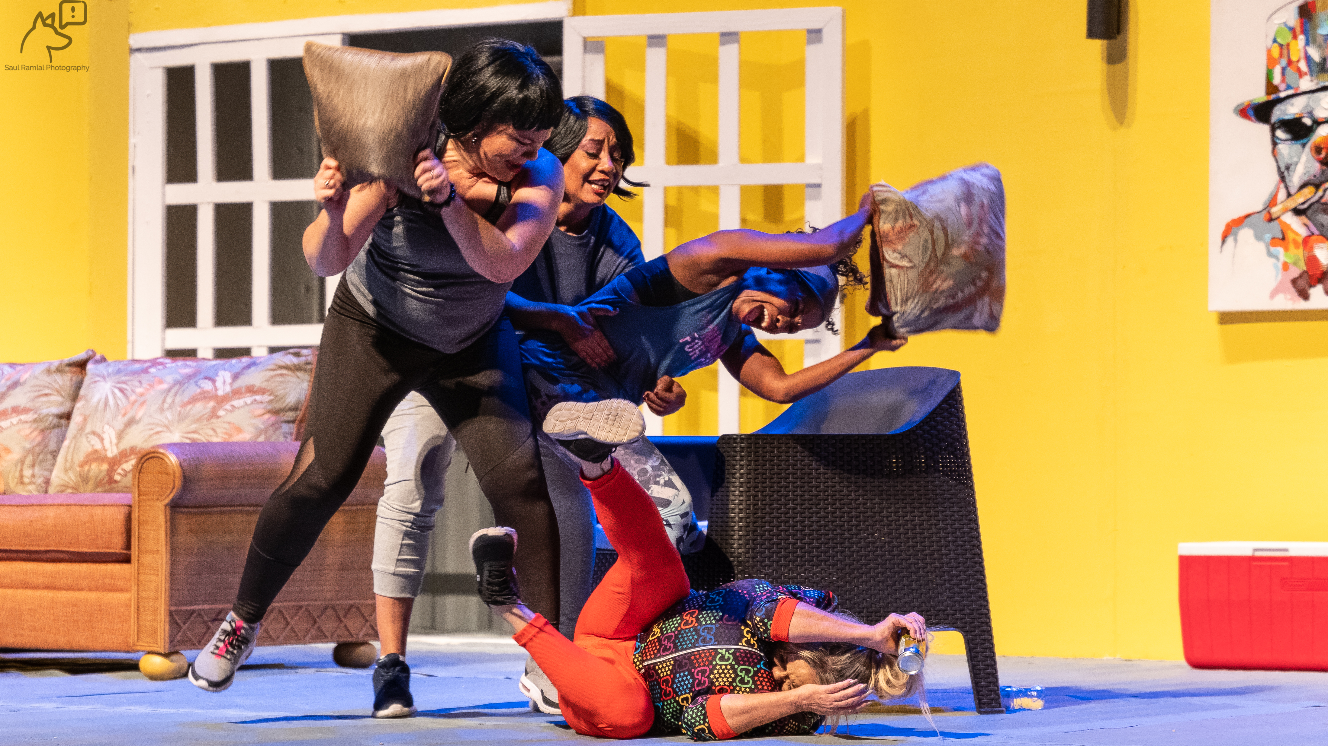 Dropping us right into the thick of the bacchanal, the play kicks off with Lavine’s character agonising with her friend Lisa (Tanker) over the fact that the police suspect her of murdering her late husband. The rest of the cast gradually show up and add their servings of (mostly relationship) drama to the mix as things unravel, collide, and explode into an uproarious showcase of comedy from the legendary leading ladies. Cathy (Salazar) arrives first and heads straight for the alcohol as she has to deal with the stress of being a single mother to a wayward 28-year-old. There is Allison (Boucaud Mason), who is still dealing with a rough divorce and losing her job, and then there’s Millie (Spencer), the confident, free-spirited cosmetologist engaged in a fling with a younger married man. Nalini (Ali) rounds out the cast of colourful characters as an exceedingly naïve country bumpkin who becomes a kind of project for Millie; a mission to teach her the ways of womanhood.