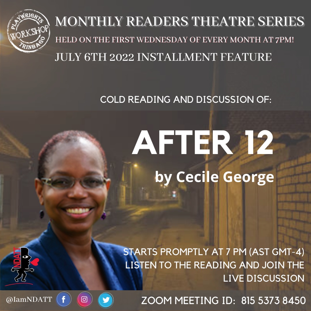 This Wednesday, NDATT’s Playwrights Workshop Trinbago features the reading of the screenplay “After 12” by Cecile George for their July instalment. The series will continue online in light of the precautionary measures implemented as a result of the COVID-19 pandemic. The reading will take place via Zoom meeting only, on July 6th, 7PM (AST GMT-4).