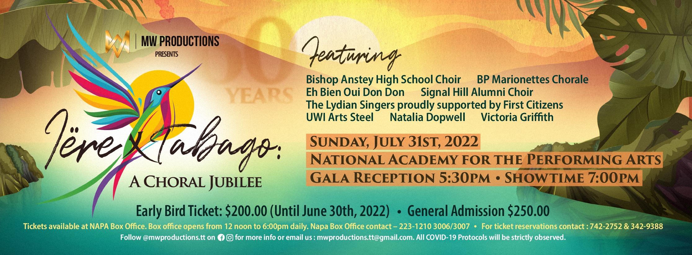 MW Productions’ Iëre X Tabago: A Choral Jubilee, will take place on Sunday 31st July, 2022, 7PM at the National Academy for the Performing Arts. The concert will be preceded by a GALA reception in the from 5:30pm to 6:30pm, featuring art pieces from 10 local artists. At the GALA audiences will be invited to raise a toast in honour of our nation’s 60th anniversary. It’ll be a celebration of unity and pride like no other, that you won’t want to miss.