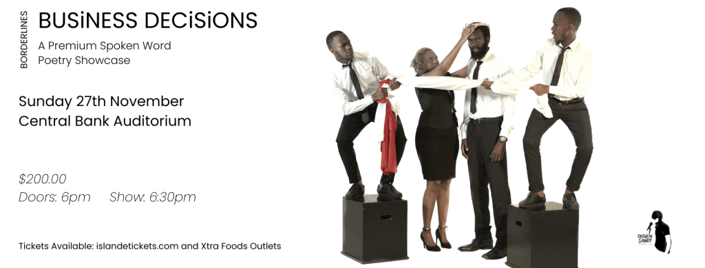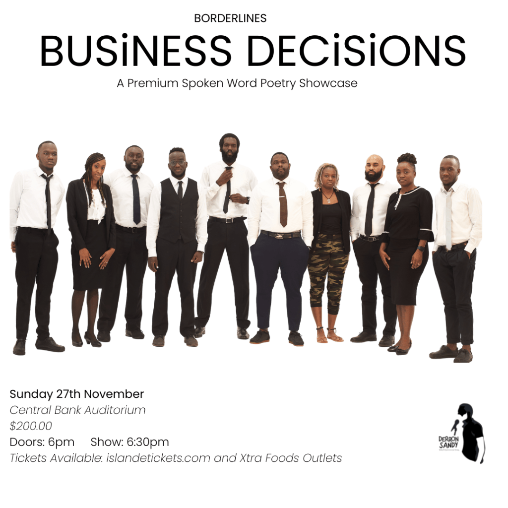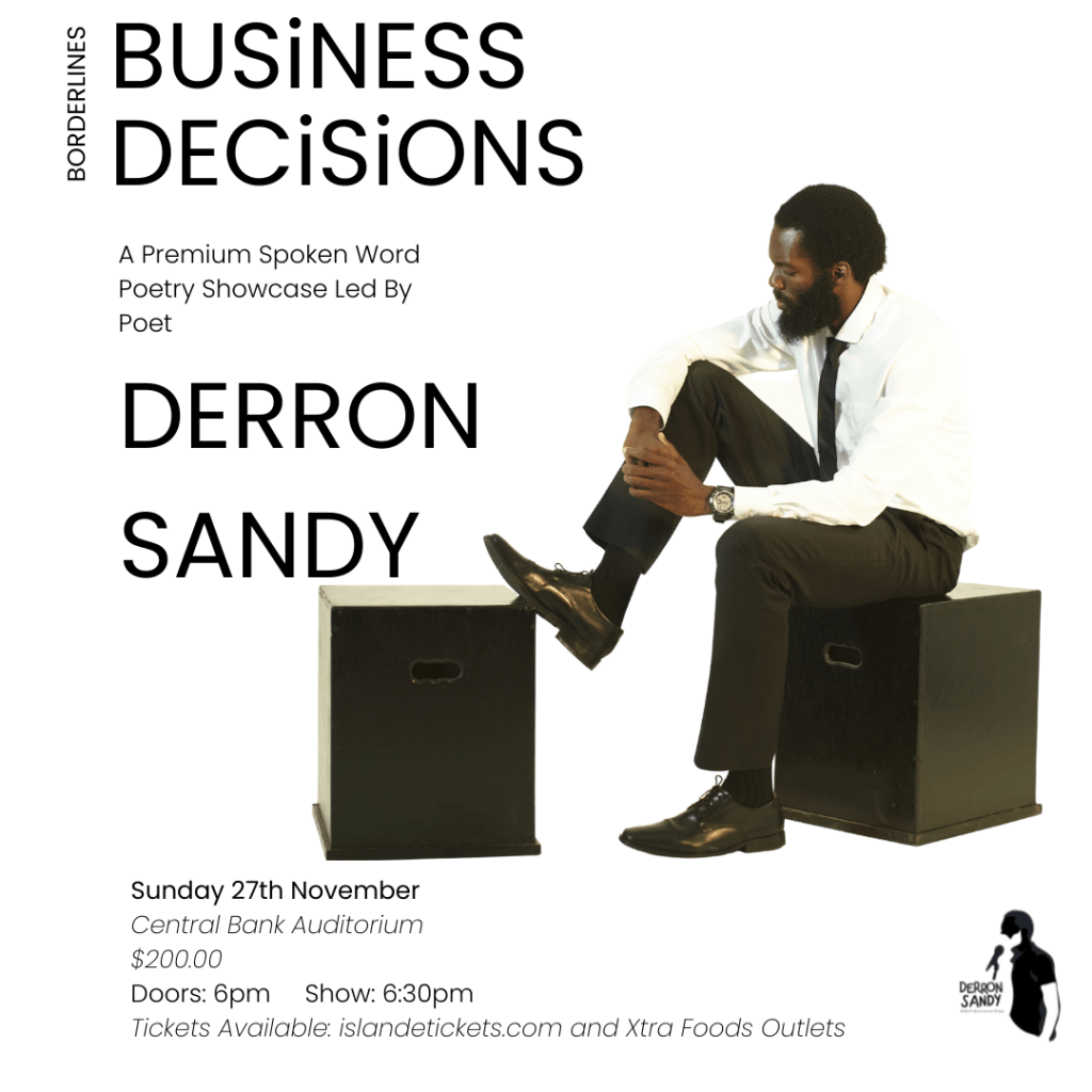 Derron Sandy is set to deliver a one-night epic performance poetry showcase at Borderlines: Business Decision . This event takes place on November 27th from 6:30pm at the Central Bank Auditorium in Port-of Spain.