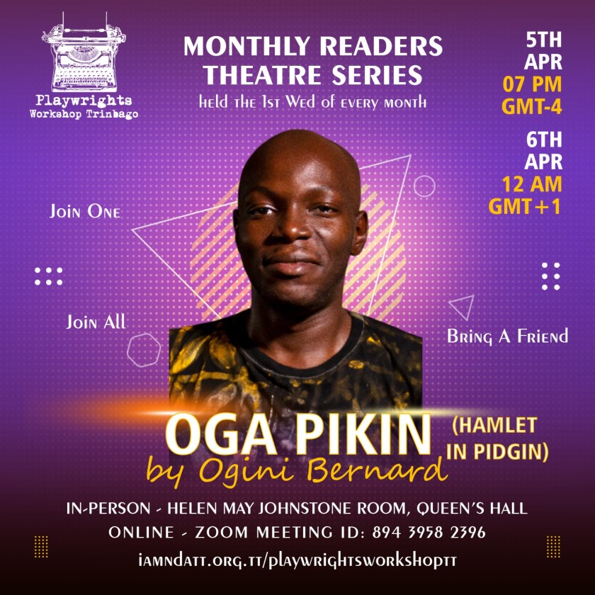 The April instalment of the Playwrights Workshop Trinbago (PWT) Monthly Readers Theatre Series (MRTS) will feature the cold reading of “Oga Pikin” (Hamlet in pidgin) by Nigerian playwright Ogini Bernard. The reading, which marks the reintroduction of in-person sessions of the MRTS after three years, will take place on Wednesday April 5 at 7:00 PM (GMT -4)/Thursday April 6 at 12:00 AM (GMT +1) at the Helen May Johnstone Room, Queen’s Hall, 1-3 St Ann’s Rd, Port of Spain, and online via Zoom.