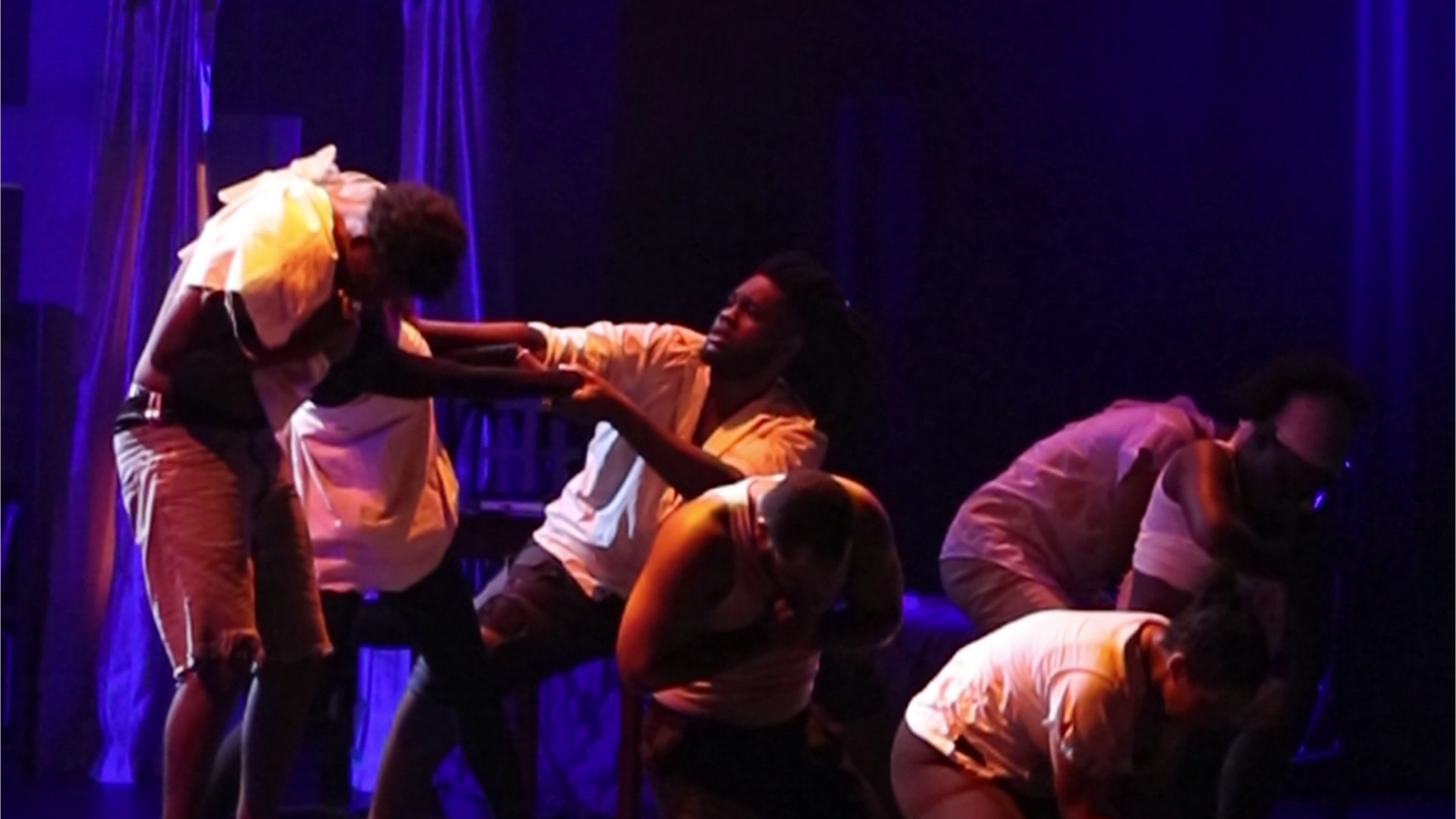 Even with all of this, however, Carnival Carol must be commended for its bravery in stepping outside conventional storytelling. It was a fusion of stage and screen, where wonderfully done filmic aspects (with cinematography by Aaron Caruth) gave context to the events that weren’t created on stage. The set was beautifully crafted, albeit a bit clustered. If Coco Chanel were in the audience she’d say that one (or a few) pieces of the set could have been left behind. There were crosses upon crosses, and whether it was supposed to convey the overbearing nature of the household dogma it ended up corralling the actors into their physical spaces. Music direction and underscoring by Dike Samai added a lovely dimension to the storytelling. He gets a chance to showcase his expertise in composition and film scoring throughout the production. Synthyche Bishop’s directing gave the actors permission to play with the full dimensions of the set, not being stuck on the front-facing action many plays can fall trap to.