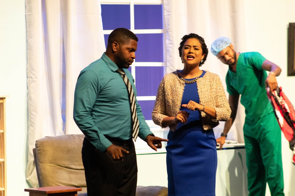 Originally written by a celebrated veteran of British farce, Ray Cooney, this production of It Runs in the Family offered a delightfully localised version of his script. It focuses on a successful, middle-aged doctor named Dr. Collymore (Kearn Samuel) who is “happily” married to Mrs. Collymore (Shevonne Metivier). At the start, all is well and good as Collymore is preparing to deliver a prestigious keynote speech at an important conference filled with bigwigs, which, if successful, will catapult his career to new heights – all with his boss (Patti-Anne Ali) bearing down on him. However, things are quickly thrown into disarray when he is thrust into the kind of situation that might be better moderated by Maury or Jerry Springer. Ms. Tate (Paula Hamilton-Smith), an ex-nurse with whom Collymore had an illicit affair 19 years prior, shows up in the doctor’s common room to deliver the troublesome news to the good doctor that, surprise, he has an eighteen-year-old son, Lesie (Nicholas Subero). Each moment goes hilariously haywire from there as Collymore comes up with increasingly ridiculous solutions to his compounding problems involving doctors, nurses, policemen, and patients alike along the way.