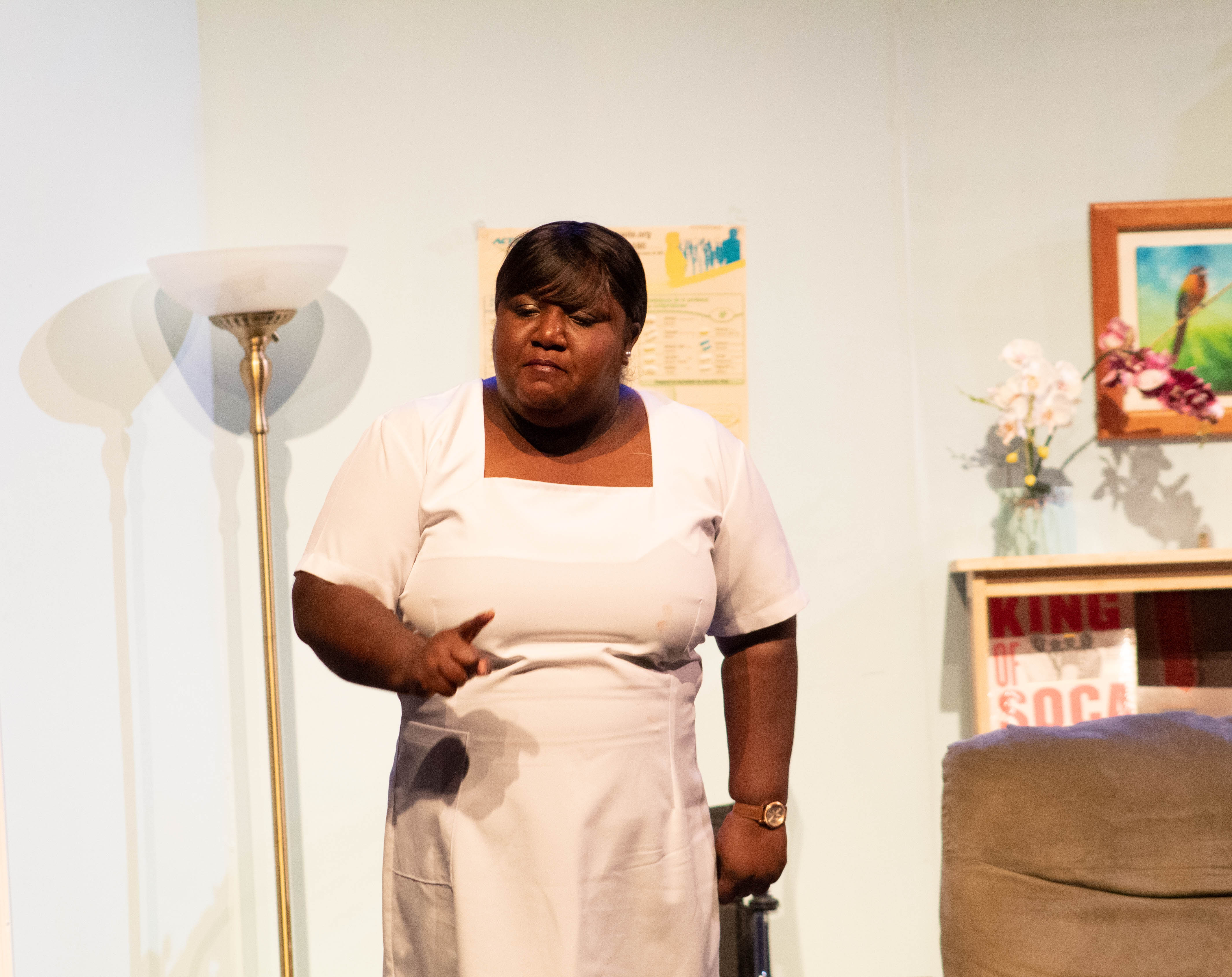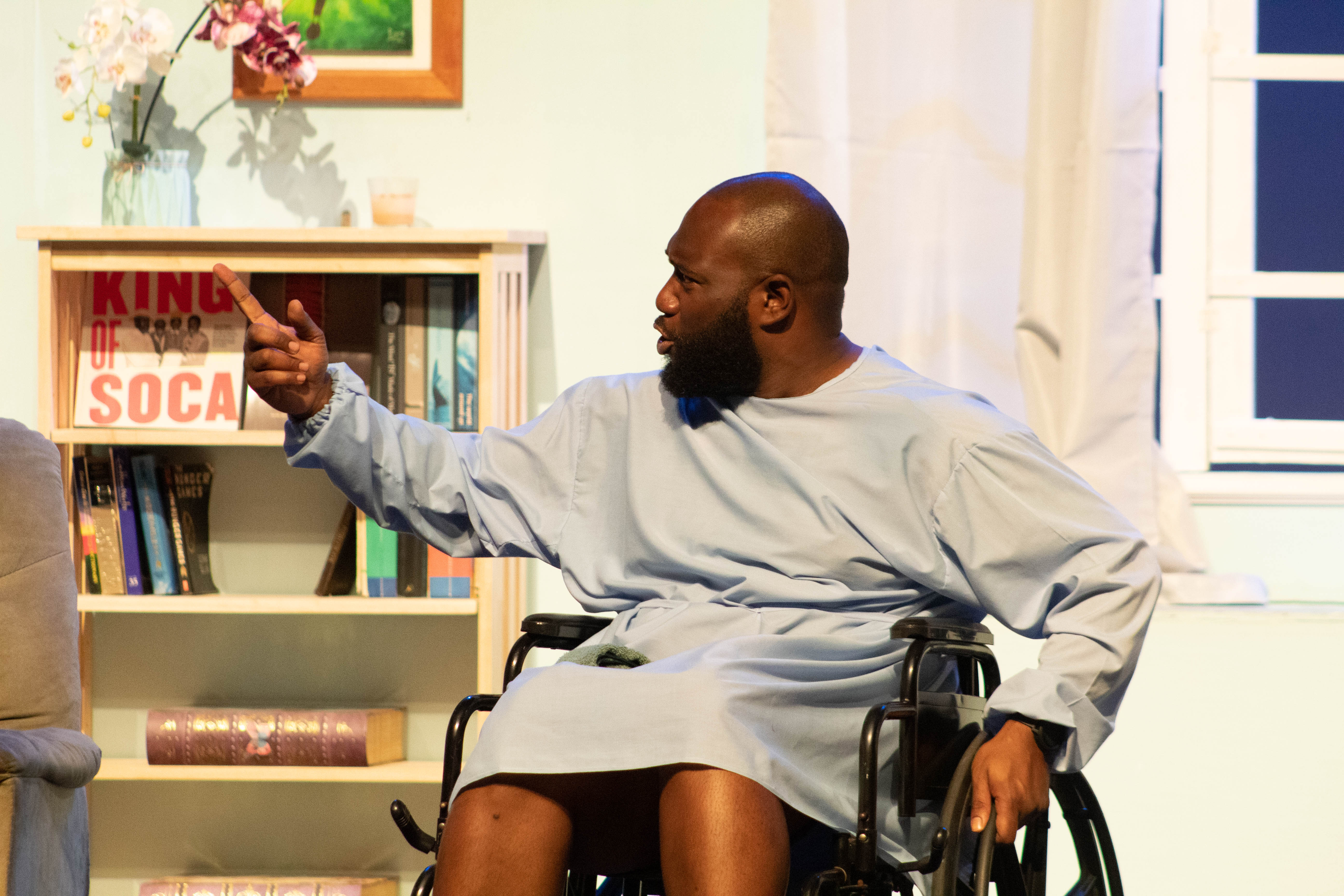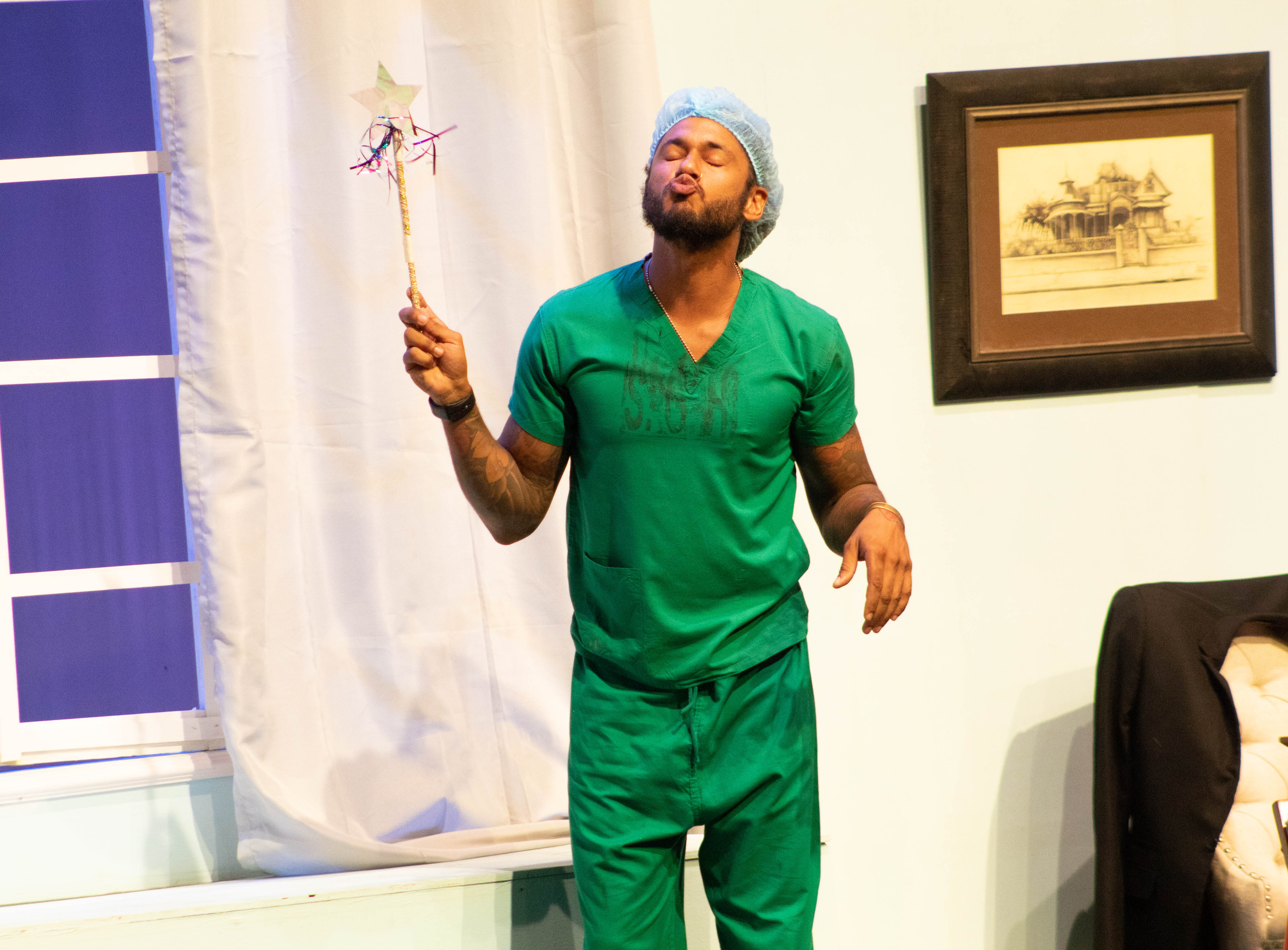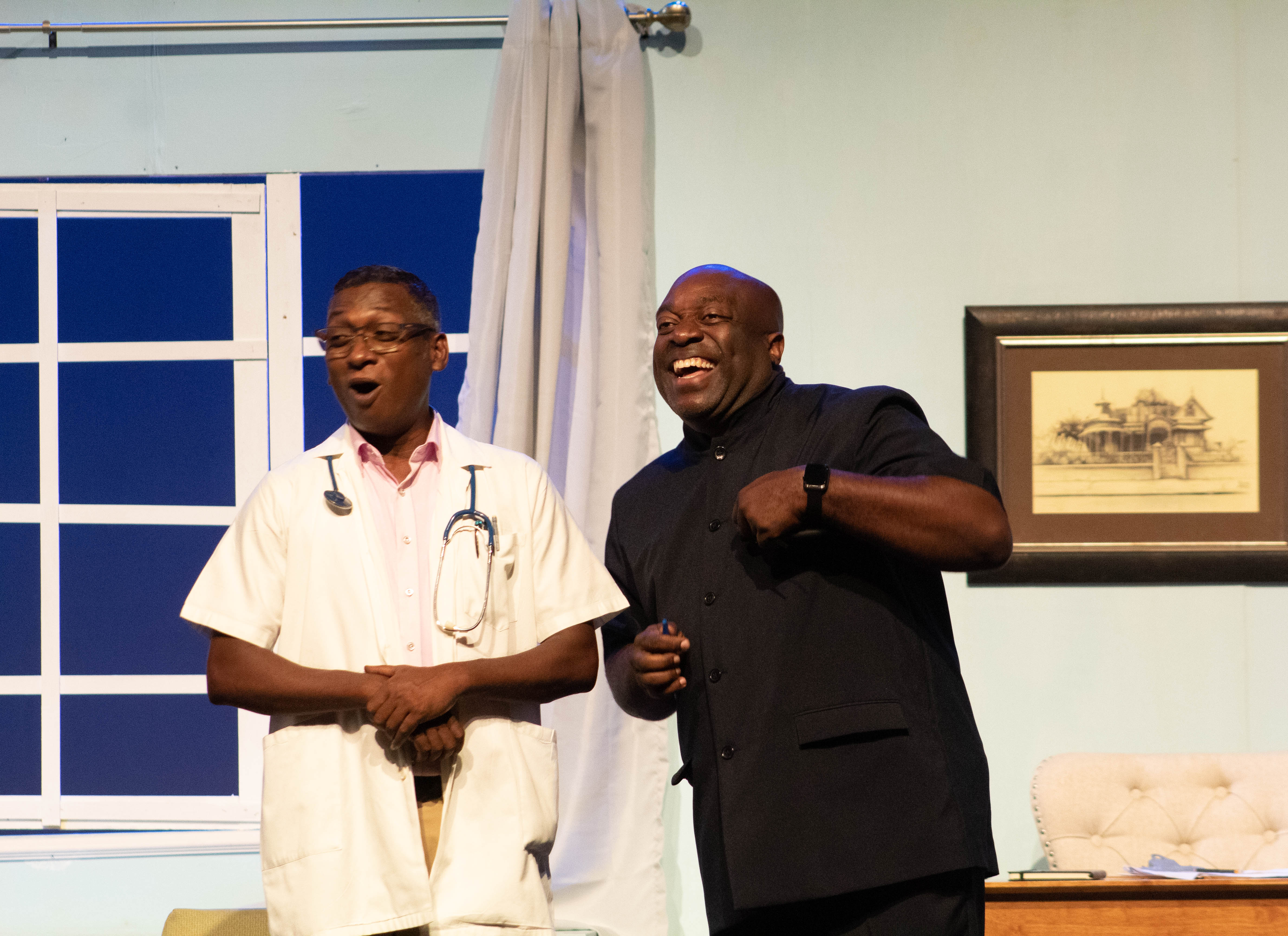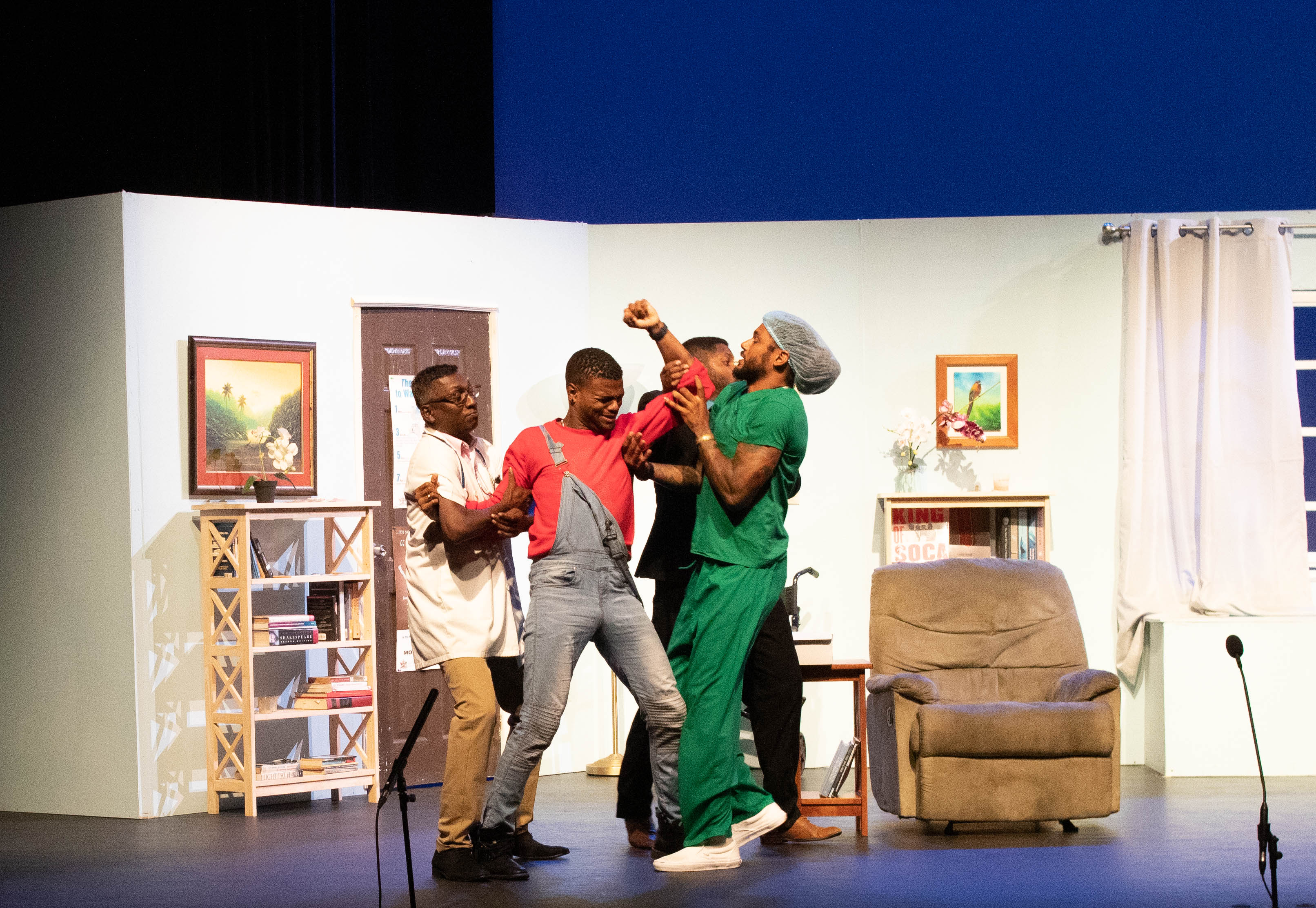 The rest of the cast performed their parts with fervour and kept pace with these electric leads with splendid performances all around. Paula Hamilton-Smith was playfully feminine as the doting mother/former illicit lover, Jane Tate, giving merit to statements like “that is woman!” from the male characters. Kevon S. Brooks was also hilarious in his turn as “Mr. Leslie” the sometimes-wheelchair-bound, very outatiming Alzheimer’s patient who somehow gets tangled up in Collymore’s convoluted mess… or maybe that’s not his name… but who knows at this point? Wendell Etienne’s performance as the police sergeant was also noteworthy as he provided a good counterpoint to the craziness as a sort of straight man amidst the chaotic characters in the hospital. Side characters like Rachel Bascombe’s no-nonsense Matron, Gervais Aleong’s Easter play-obsessed surgeon, and Nicholas Subero’s childish-yet-troublesome Leslie, all had their moments to shine and delivered on the funny.