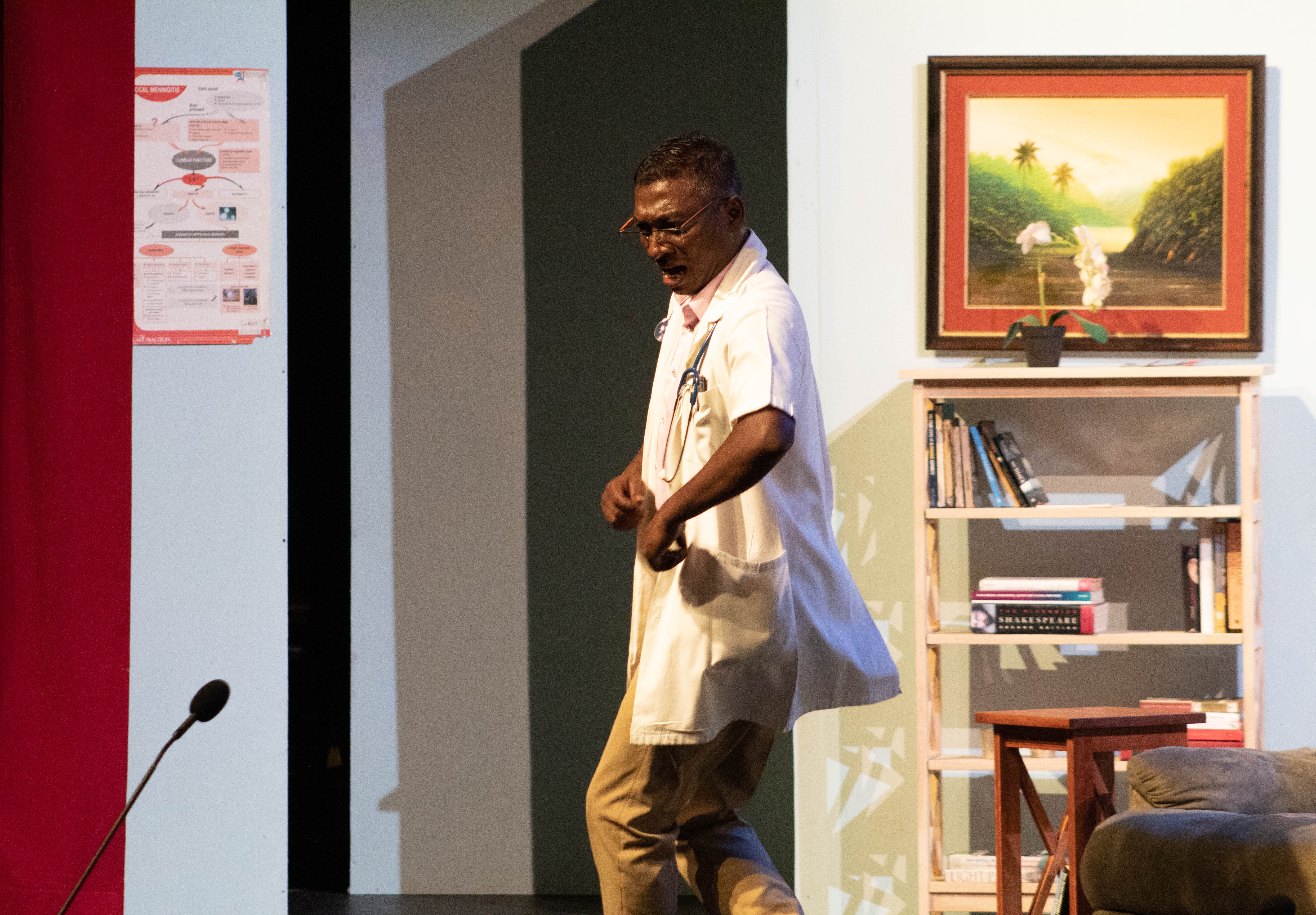 As the central character in the play, Kearn Samuel played the cocky Dr. Collymore with skill and confidence. Samuel kept the pace flowing with his rapid fire responses, never missing beats, remembering an impressive volume of witty lines to keep the plot on track and drive the story forward with only a few minor hiccups. In this regard he reminded me of the kind of wordy, witty, energetic lead performances the late Raymond Choo Kong would give in similar productions.