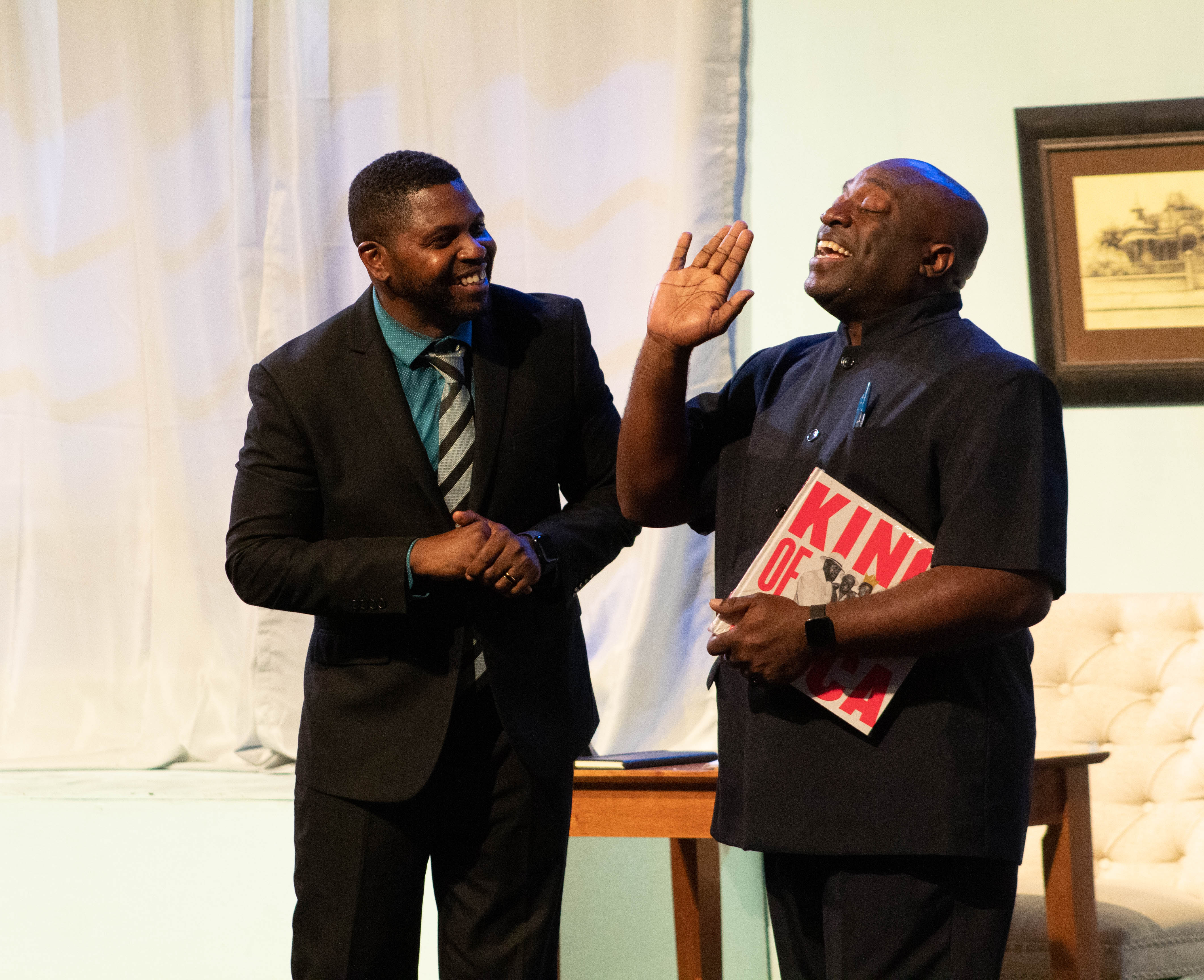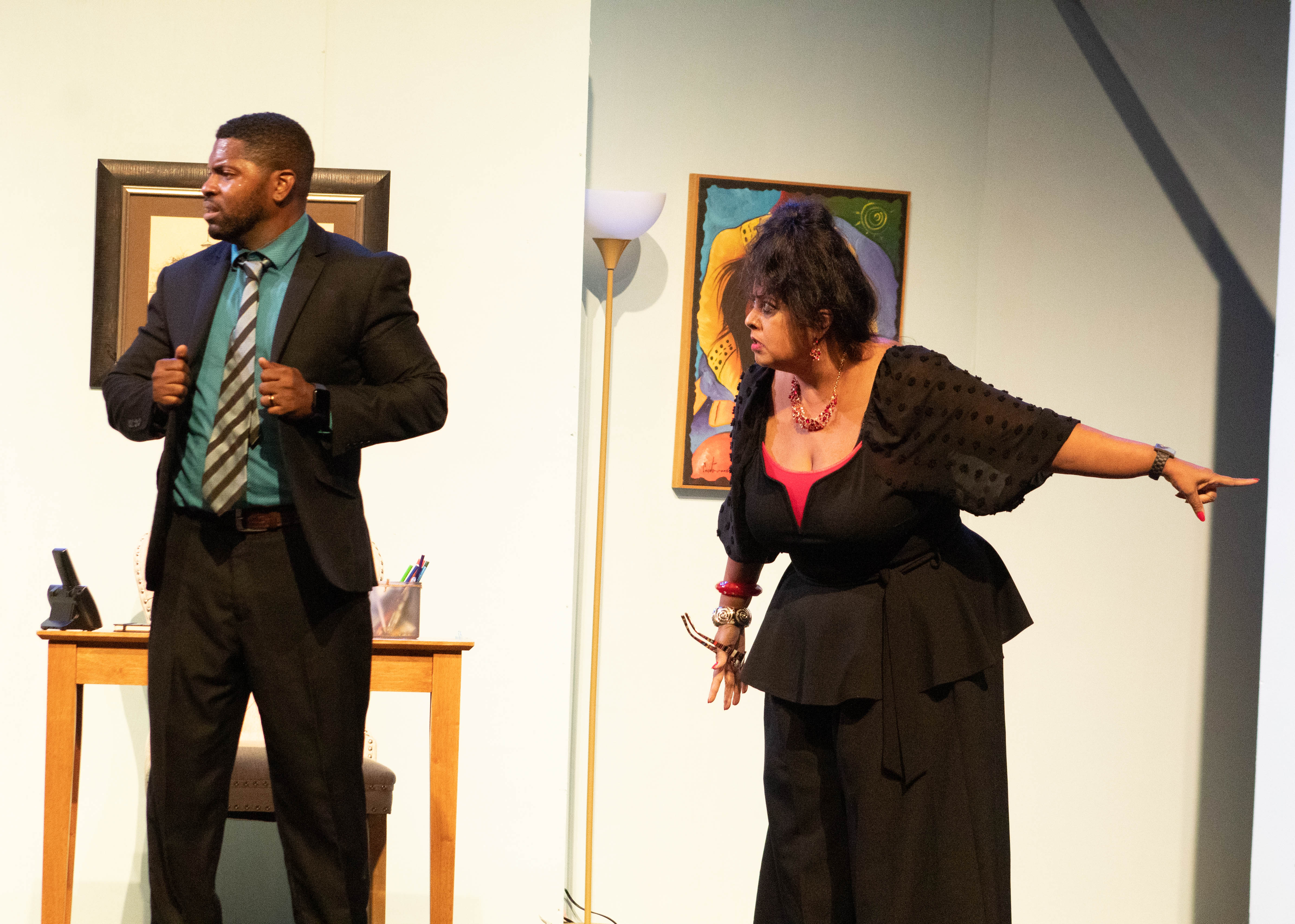 As a farce, the script was expectedly light. There is not much to explore here thematically, but it delivers on what it promises. The localisation of the dialogue, characters and situations was done well enough. There was only one element I felt failed to connect with the audience and add to the play and that was the character of Collymore’s boss, Dr. Rampersad played by Patti-Anne Ali. Ali. Like her castmates, Ali played the character with admirable commitment, but there was a definite disconnect with how the presence of this character was intended to land and the effect she actually had on the audience. The purpose of the character was to add tension by hounding Collymore about his speech, threatening his career, and making sure the audience is acutely aware of the impending deadline. A quirk of personality she was given was that her hair became increasingly dishevelled throughout the play. As she was mostly disconnected from the shenanigans of the other characters, and she only had one line about it – “I’m having a bad hair day!” – the joke didn’t land quite as well. By the end, it felt like the humour of the character may have been lost in translation as the play made its way across the pond and Dr. Rampersad the character may have been more effective as an off-stage presence for most of the play who shows up closer to the end.