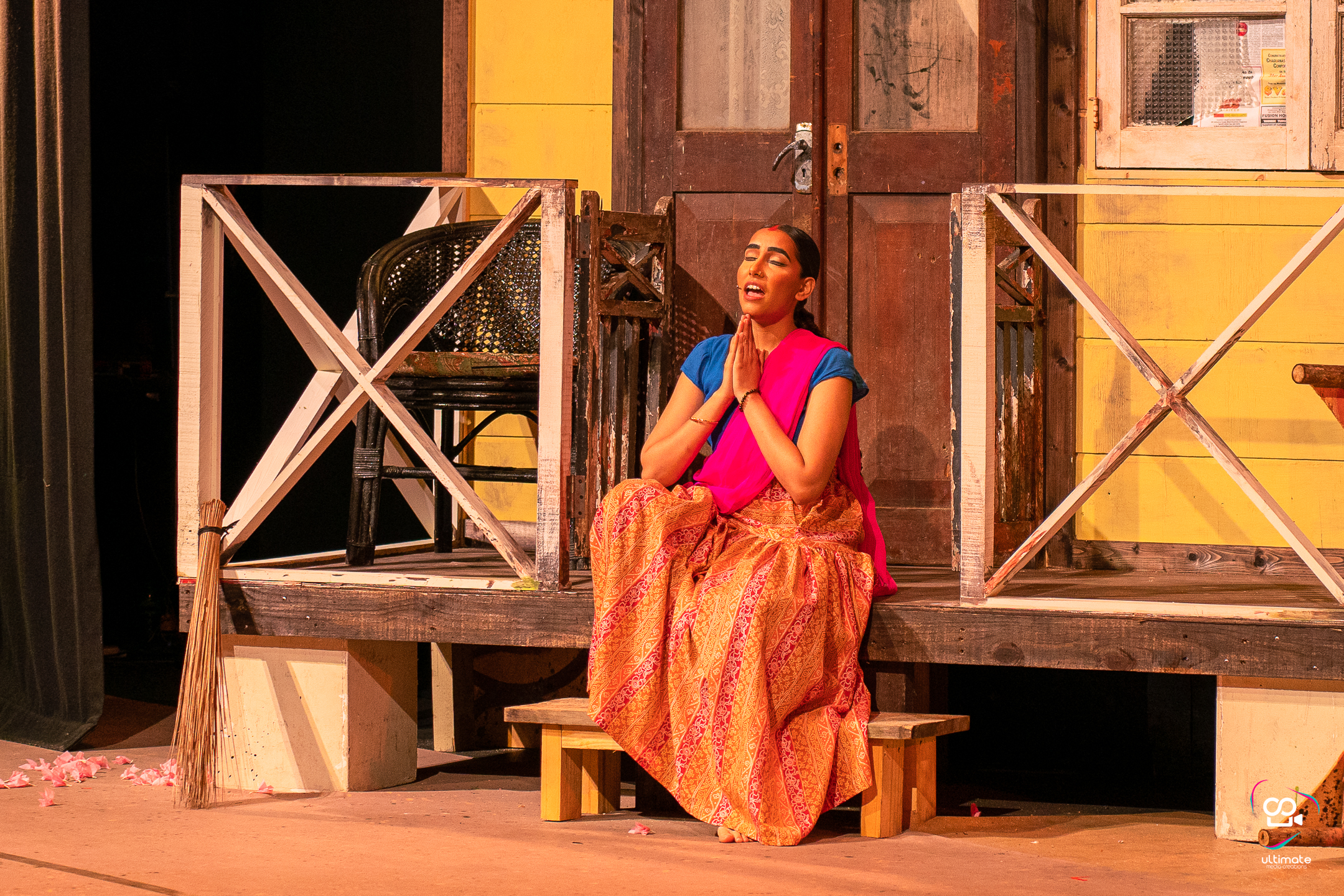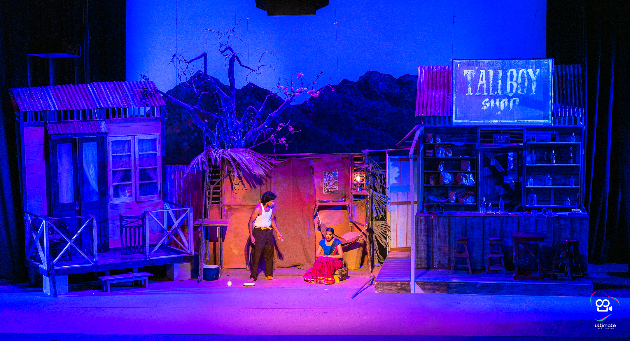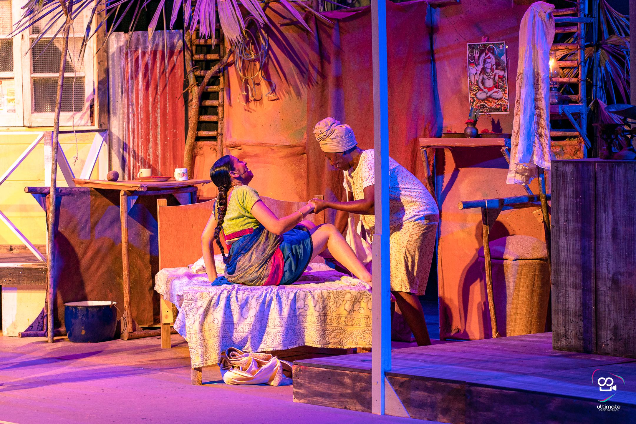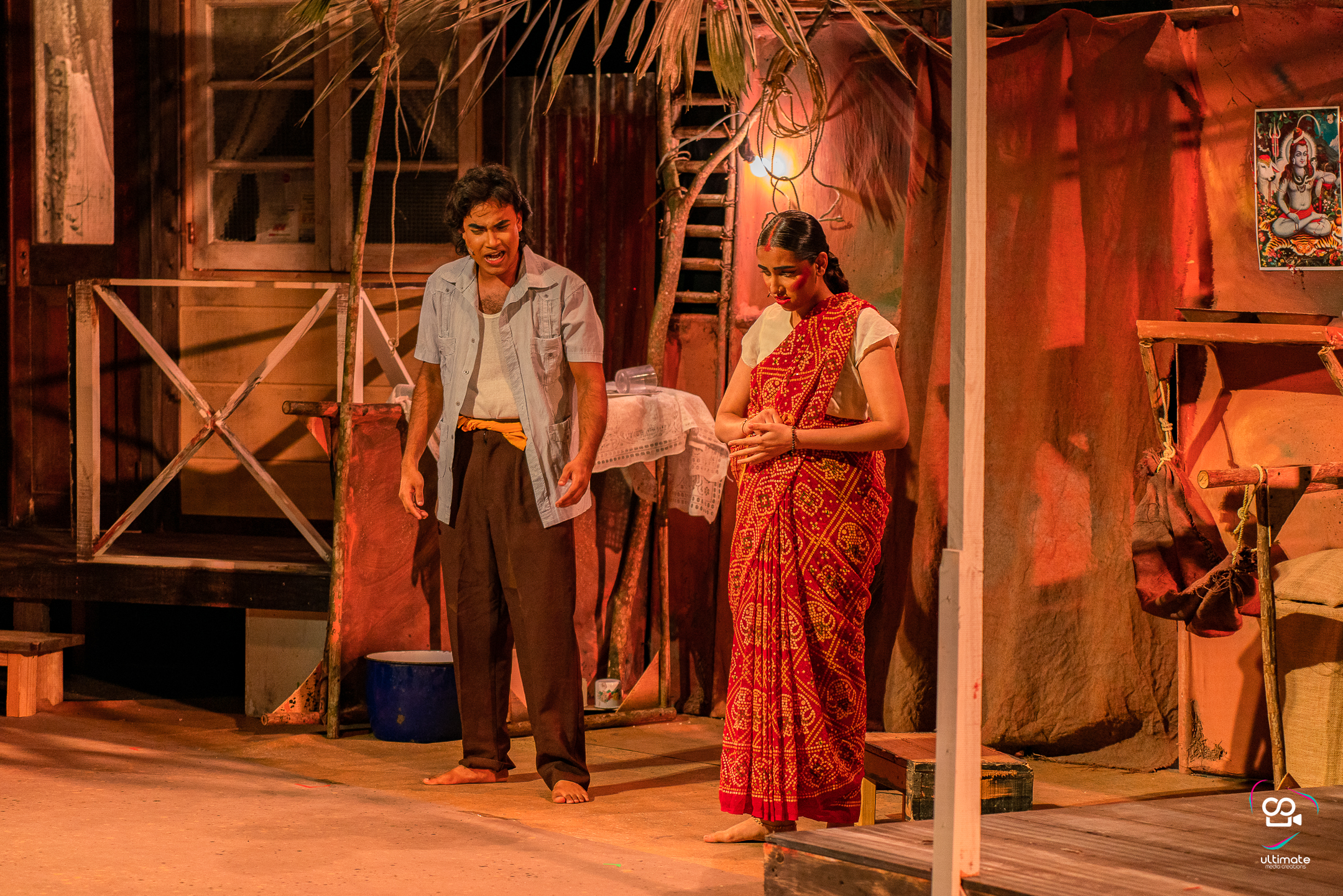 As the curtains parted at 6PM, a shiver of awe and subdued surprise rippled through the packed theatre as the beautiful, opulent set design was revealed. With the foreground open for the performers to move about, the background was occupied by meticulously constructed renditions of vintage village structures. On stage right, a quaint wooden house with a veranda stood proudly. Tall Boy’s Rumshop was on the opposite end (stage left), with a beautifully rustic bar and a table with chairs that gave the characters a dynamic space in which to interact. Squished in between these, an ajoupa – a humble mud hut that occupied the center of the stage, with tell-tale signs like pictures of Hindu deities and a peerha (small bench) that hinted toward Indian inhabitants. Scenic designer Narad Mahabir truly outdid himself and delivered a truly stunning visual set that felt authentic to the characters occupying the spaces and was fitting for the 1940’s setting of the play.