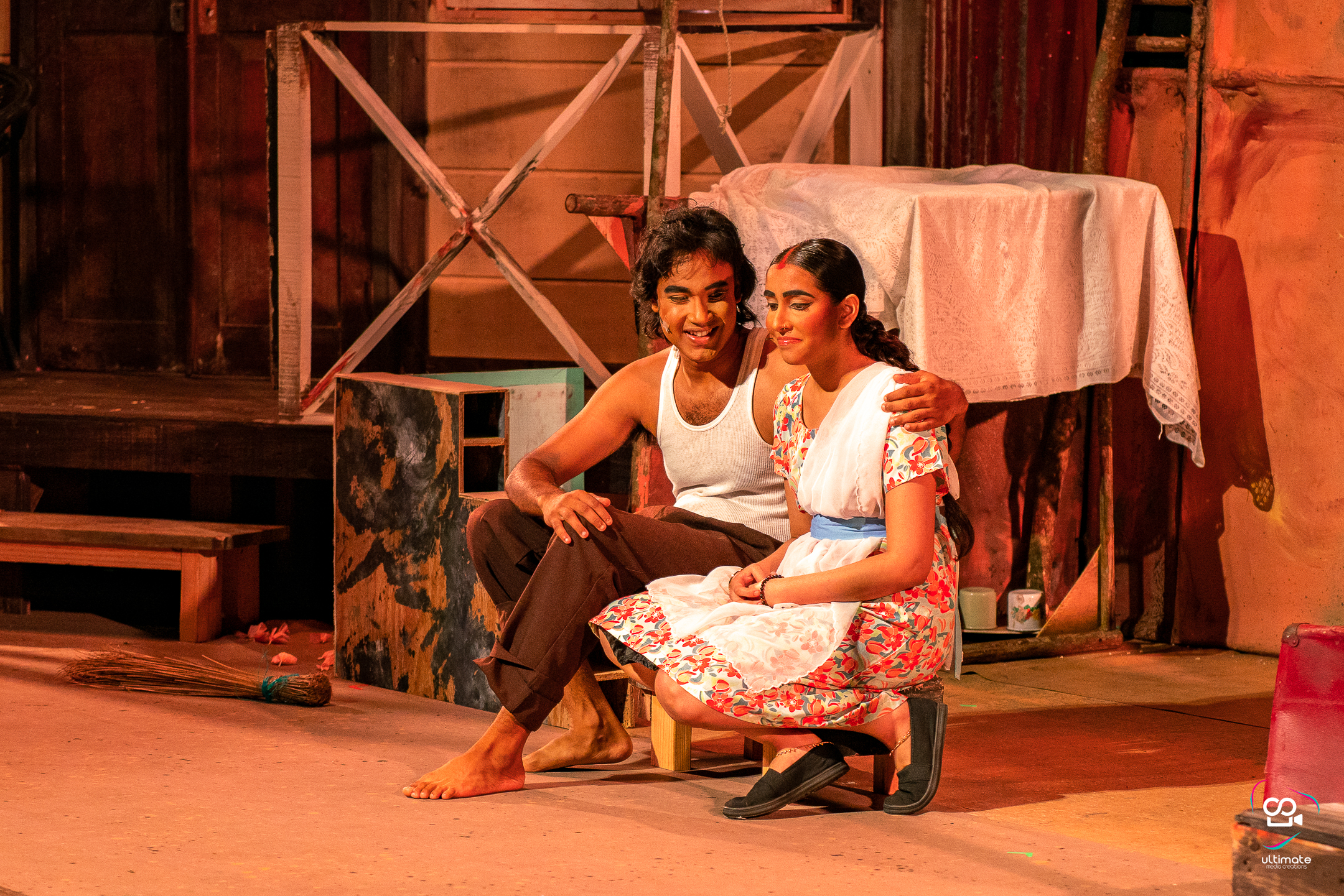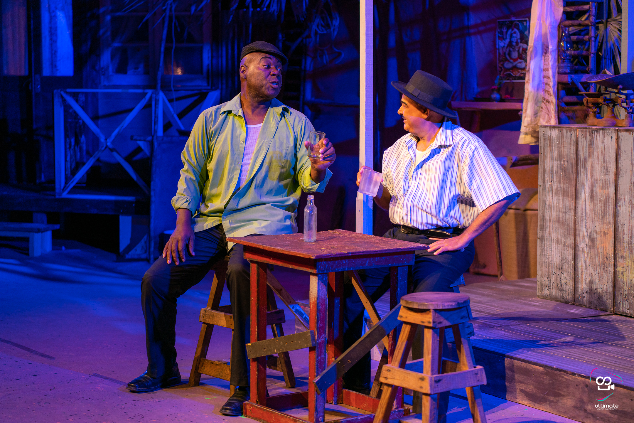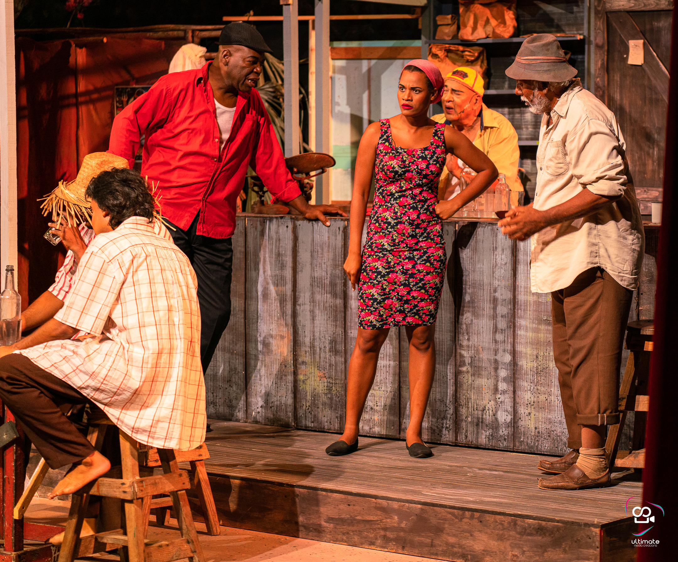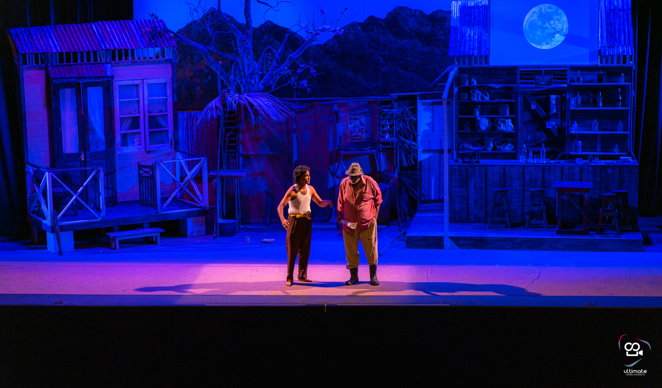 As the curtains parted at 6PM, a shiver of awe and subdued surprise rippled through the packed theatre as the beautiful, opulent set design was revealed. With the foreground open for the performers to move about, the background was occupied by meticulously constructed renditions of vintage village structures. On stage right, a quaint wooden house with a veranda stood proudly. Tall Boy’s Rumshop was on the opposite end (stage left), with a beautifully rustic bar and a table with chairs that gave the characters a dynamic space in which to interact. Squished in between these, an ajoupa – a humble mud hut that occupied the center of the stage, with tell-tale signs like pictures of Hindu deities and a peerha (small bench) that hinted toward Indian inhabitants. Scenic designer Narad Mahabir truly outdid himself and delivered a truly stunning visual set that felt authentic to the characters occupying the spaces and was fitting for the 1940’s setting of the play.