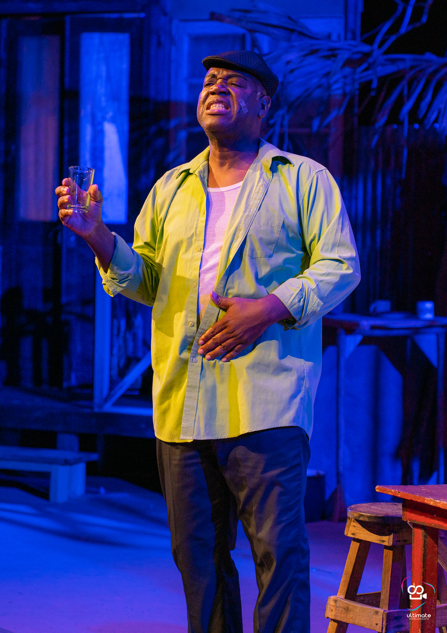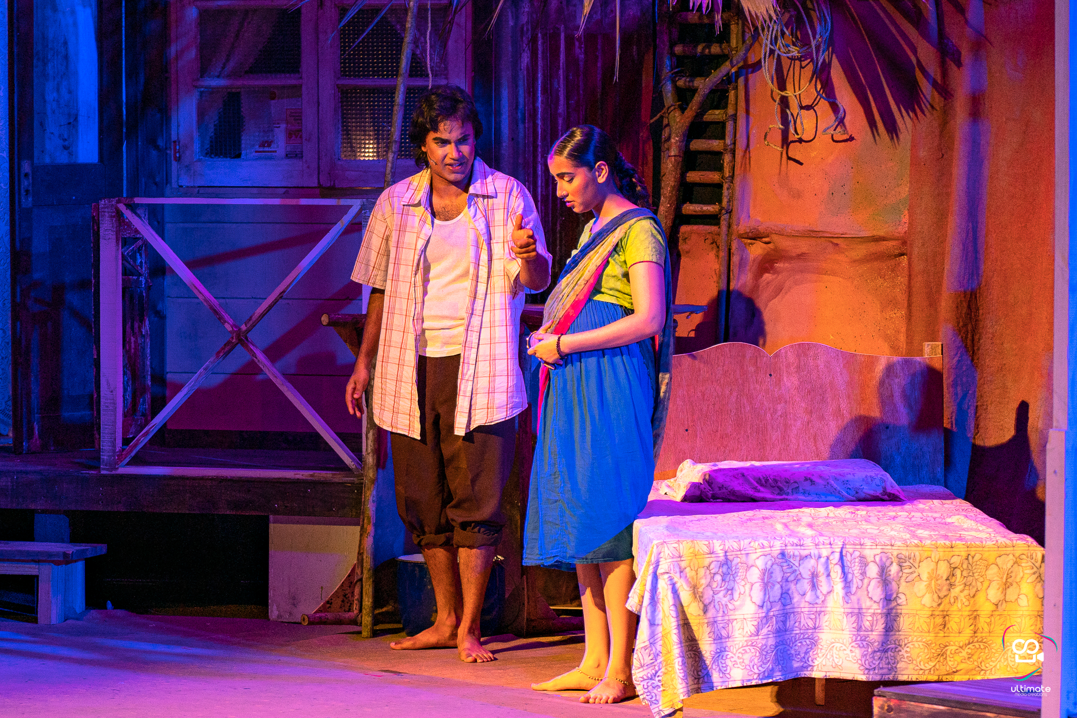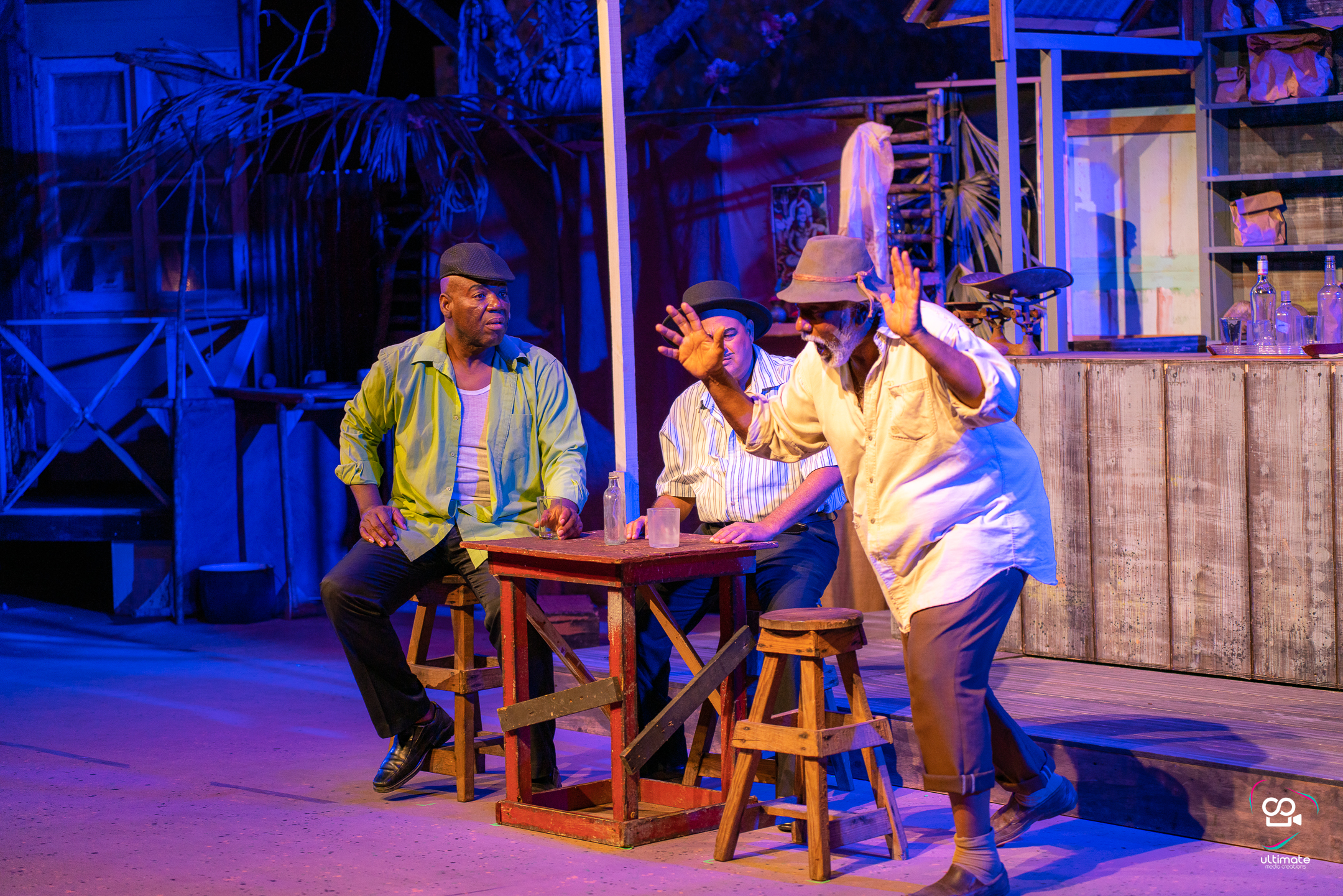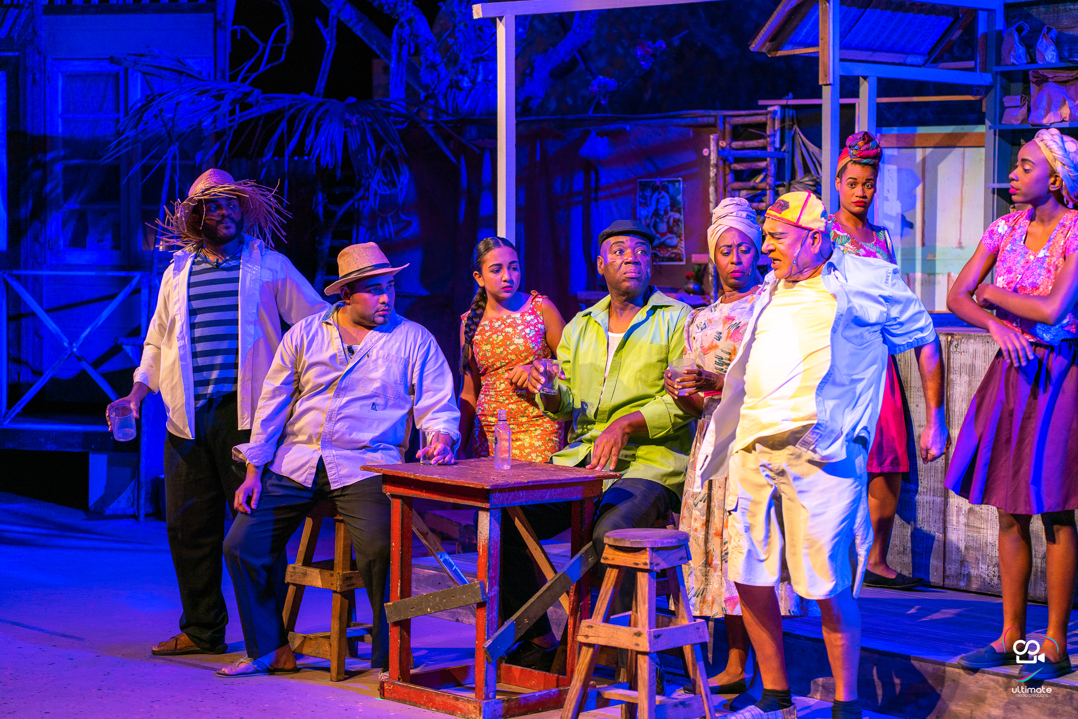 As the curtains parted at 6PM, a shiver of awe and subdued surprise rippled through the packed theatre as the beautiful, opulent set design was revealed. With the foreground open for the performers to move about, the background was occupied by meticulously constructed renditions of vintage village structures. On stage right, a quaint wooden house with a veranda stood proudly. Tall Boy’s Rumshop was on the opposite end (stage left), with a beautifully rustic bar and a table with chairs that gave the characters a dynamic space in which to interact. Squished in between these, an ajoupa – a humble mud hut that occupied the center of the stage, with tell-tale signs like pictures of Hindu deities and a peerha (small bench) that hinted toward Indian inhabitants. Scenic designer Narad Mahabir truly outdid himself and delivered a truly stunning visual set that felt authentic to the characters occupying the spaces and was fitting for the 1940’s setting of the play.