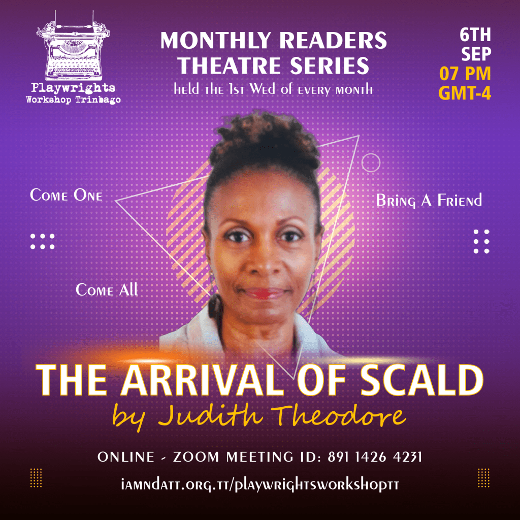 The September instalment of NDATT’s Playwrights Workshop Trinbago (PWT) Monthly Readers Theatre Series (MRTS), will feature the cold reading of The Arrival of Scald, a new script written by Judith Theodore. The reading will take place today, Wednesday September 6 at 7:00 PM (GMT -4) online via Zoom only.