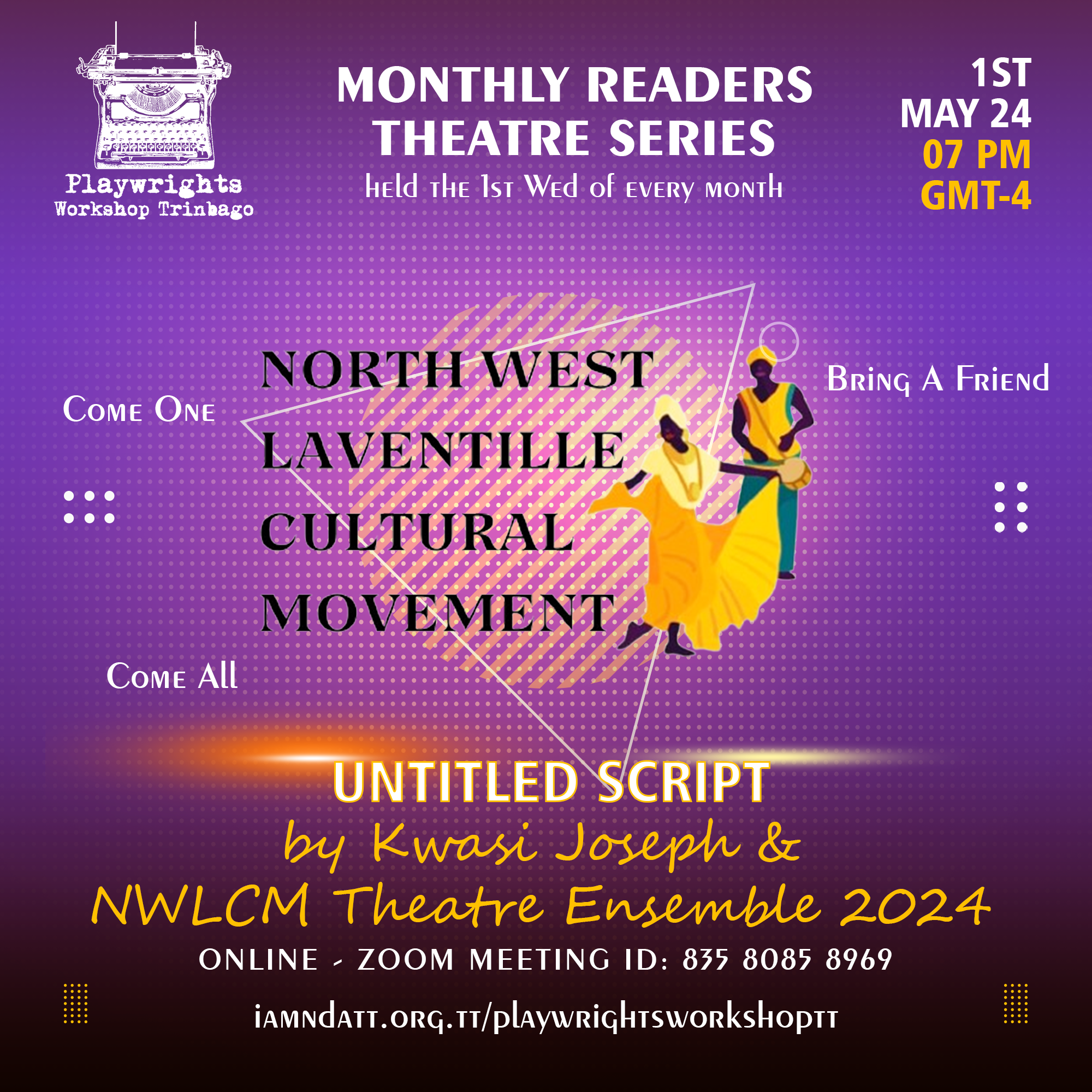 The May instalment of the Playwrights Workshop Trinbago (PWT) Monthly Readers Theatre Series (MRTS), held the first Wednesday of every month, will feature the reading of an untitled script by Kwasi Joseph and the North West Laventille Cultural Movement Theatre Ensemble 2024. The reading will take place on Wednesday May 1 at 7:00 PM (GMT -4) online via Zoom only.