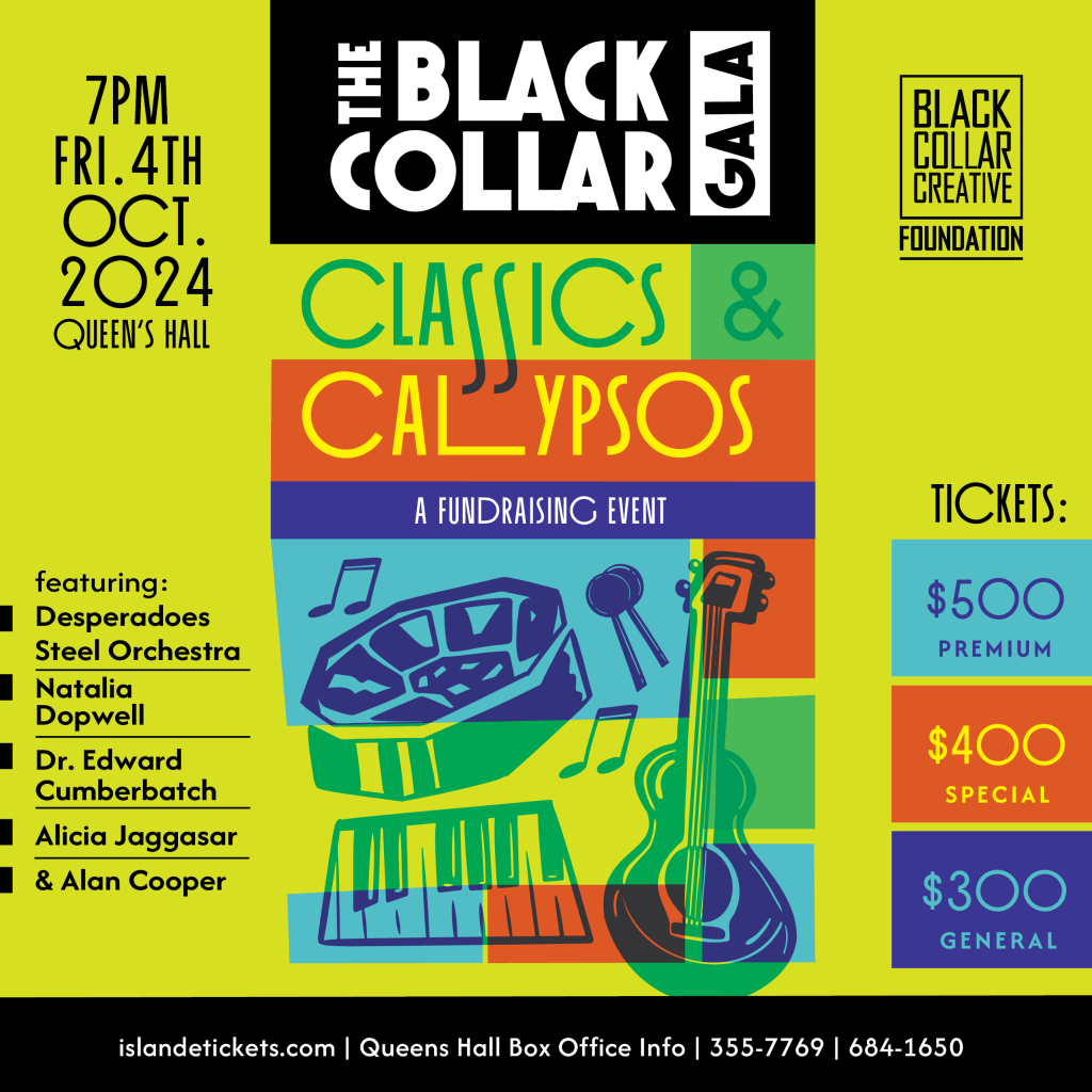 Black Collar Creative Foundation is proud to announce its inaugural event, ‘The Black Collar Gala: Classics and Calypsos,’ on October 4th, 2024, at 7:00 pm, in The Winifred Atwell Auditorium at Queen’s Hall. In celebration of Calypso History Month, this special evening will blend the sounds of steel, piano, classical vocals, and calypso with some of the finest local talents.