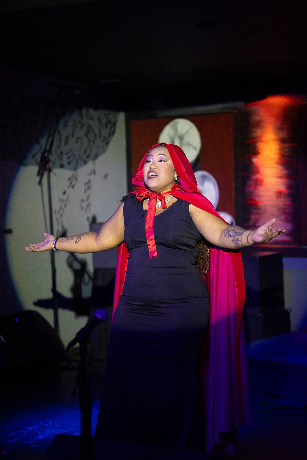 Along that same route, the costuming also missed an opportunity to reinforce the concept of love. The all-black attire, while practical given the space limitations, had the consequence of taking away the colour from the vibrancy and diversity of the stories being told. Traditional cabaret often reflects its characters through costumes, and here, the use of accessories like hats, oversized glasses and much more felt more functional than artistic, especially in the performance of “Think of Me” from The Phantom of the Opera where a red hooded-cape was used as an accessory, which unfortunately caused my suspension of disbelief to stray from the 1919 stage of the Paris Opéra House, to the fabled story of Little Red and the Big Bad Wolf. Oh Agony! (we’ll get to that).