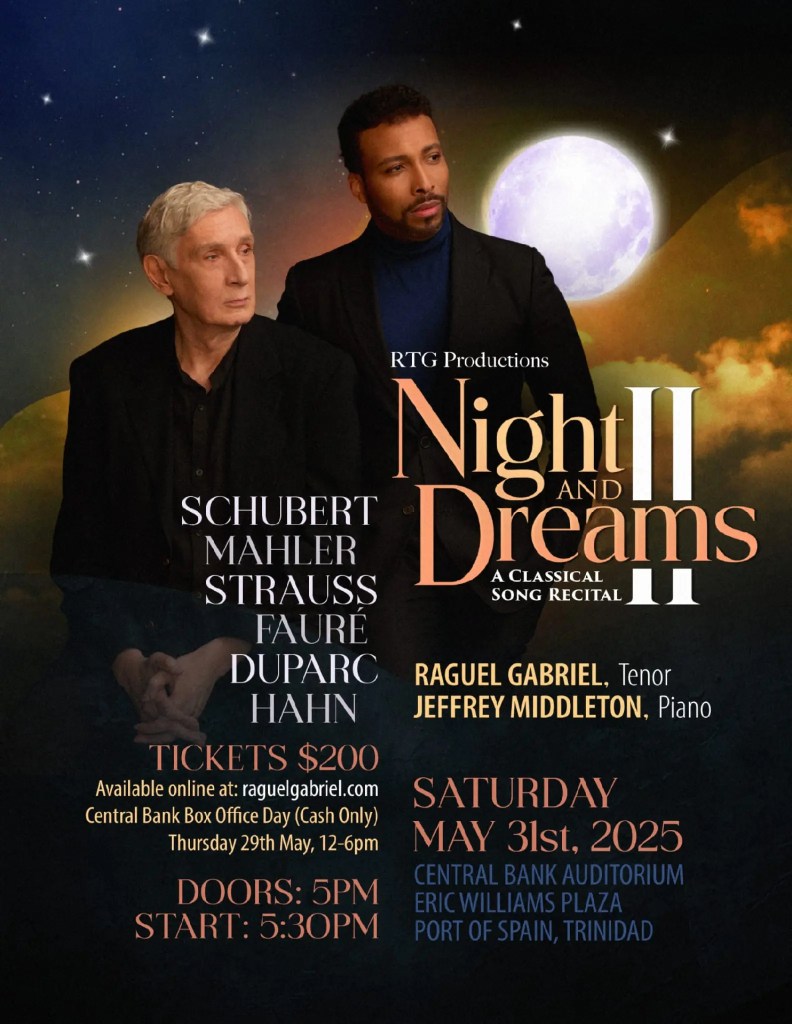 There are partnerships in music that feel predestined; forged not just by shared talent, but by shared trust and even fate. Tenor Raguel Gabriel and pianist Dr. Jeffrey Middleton have cultivated such a bond – one that began humbly over a decade ago at the Central Bank Auditorium in Trinidad and now returns to that very stage with the second edition of Night and Dreams – a recital that is as much about the music, as it is about their shared artistic voice.