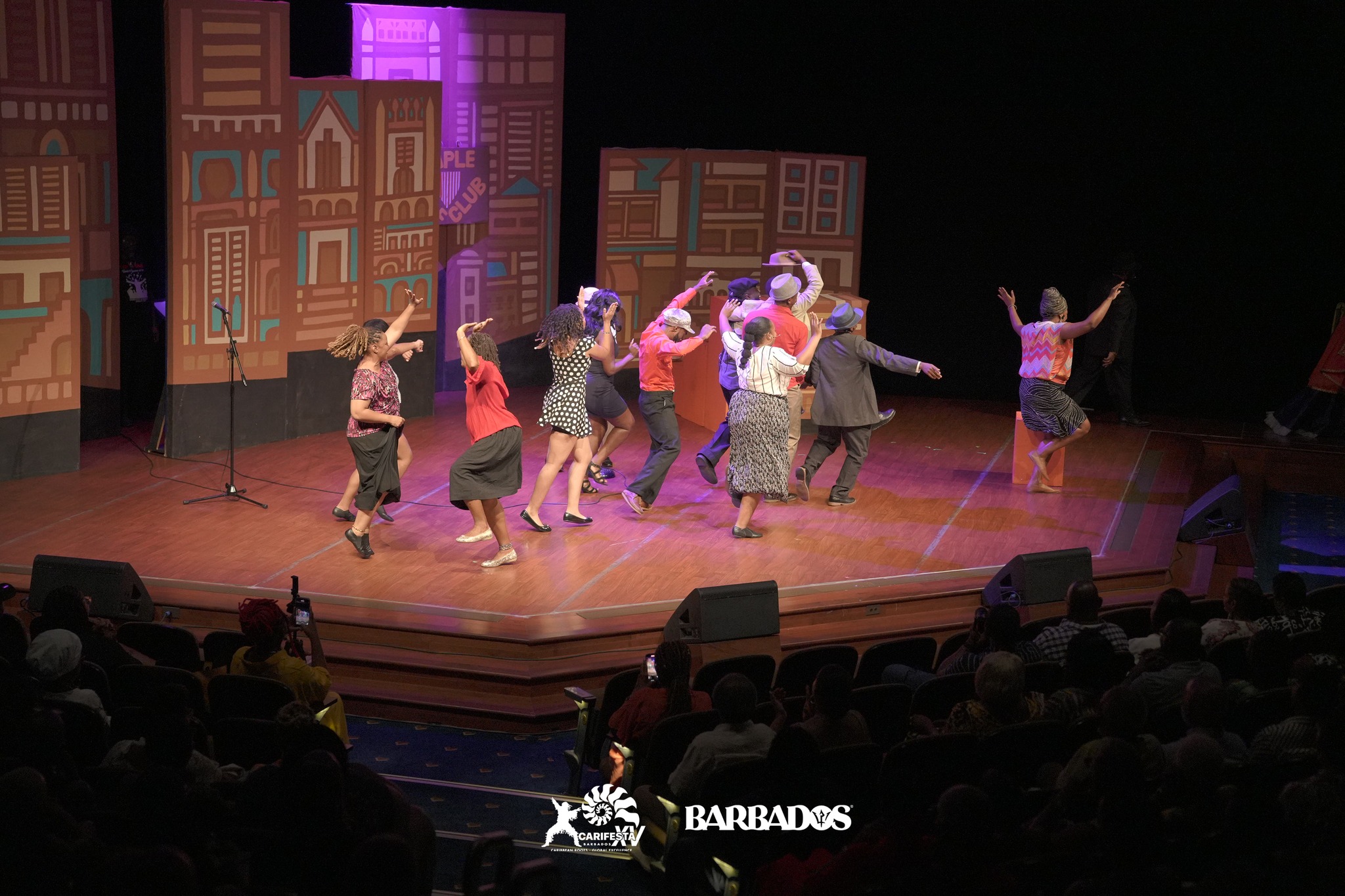 Henry Muttoo’s set design deepened this immersion with a subtle but evocative sense of place. The backdrop was composed of modest building facades, painted in layered tones of yellows and browns. At its centre, the Maple Leaf Club sign firmly situated the action on Charlotte Street, a site historically shared by calypsonians and steelpan players of the time. Stage left, Tantie’s Tea Shop provided a contrasting detail: a small communal hub where gossip and storytelling flowed as freely as tea, offering the audience an immediate sense of the social exchanges that shaped Sparrow’s world. The design was understated, likely influenced by the practical demands of moving the production from Trinidad to Barbados, but it was never lacking. Instead of overwhelming spectacle, the minimalism gave the performers room to command the stage, their voices and movements building Port of Spain more vividly than any elaborate set could.